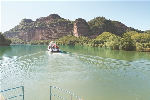 游人乘船游览郴州市飞天山。在飞天山黄泥滩附近,有4处水文崖刻。(资料图片) 湖南日报全媒体记者 张京明 摄