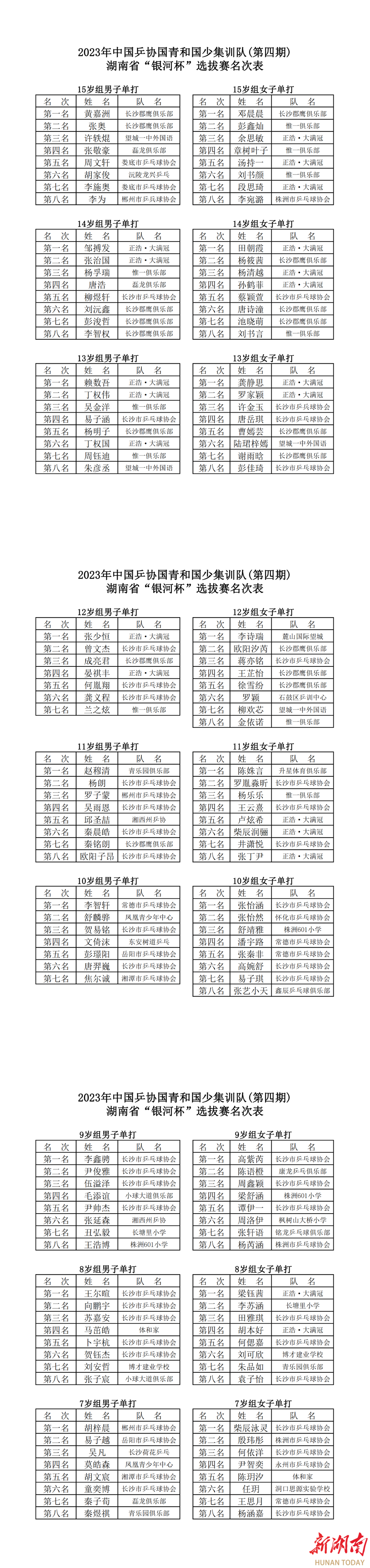 日前,2023年中国乒协国青和国少集训队(第四期)湖南省“银河杯”选拔赛在长沙市德成学校收官,各组别共50余名青少年运动员脱颖而出,将代表湖南出战中国乒协组织的第二阶段全国选拔赛。