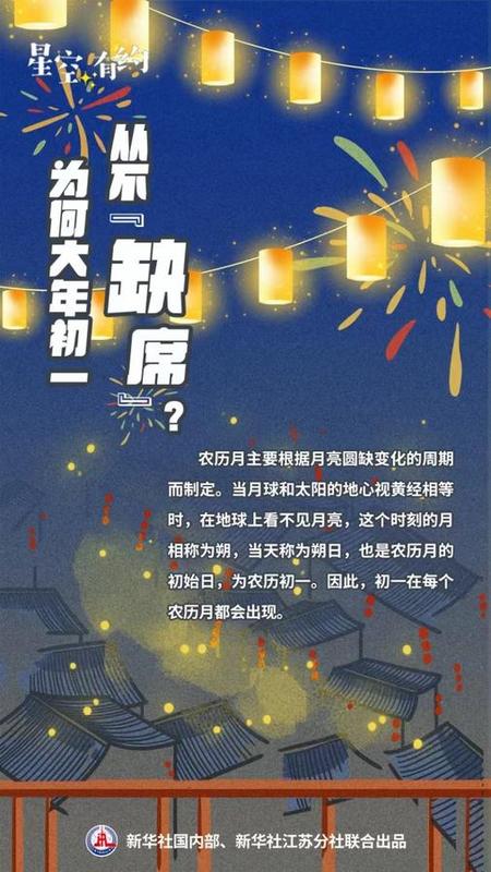 “出现这样的情况,与我国农历历算规则有关。我国农历历法中,农历月主要是根据月亮圆缺变化的周期而制定。”中国科学院紫金山天文台科普主管王科超说,月球绕地球转动一周的过程中,从地球上看,月亮呈现出不同相貌。当月球和太阳的地心视黄经相等时,在地球上看不见月亮,这个时刻的月相称为朔,当天称为朔日,是每个农历月的初始日,称为农历初一。因此,初一在每个农历月都会出现。