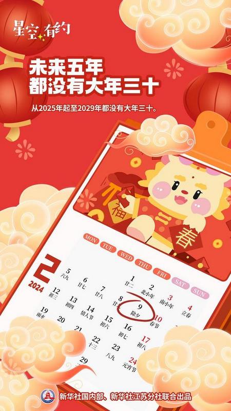 2月9日将迎来大年三十。翻开日历你会发现,2024年是未来几年中最后一个有大年三十的年份。2025年至2029年的5年里,都没有大年三十,大年二十九过后,就将迎来大年初一。大年三十去哪儿了?为什么大年三十会时不时“玩消失”,大年初一从不“缺席”?天文科普专家为您解惑。