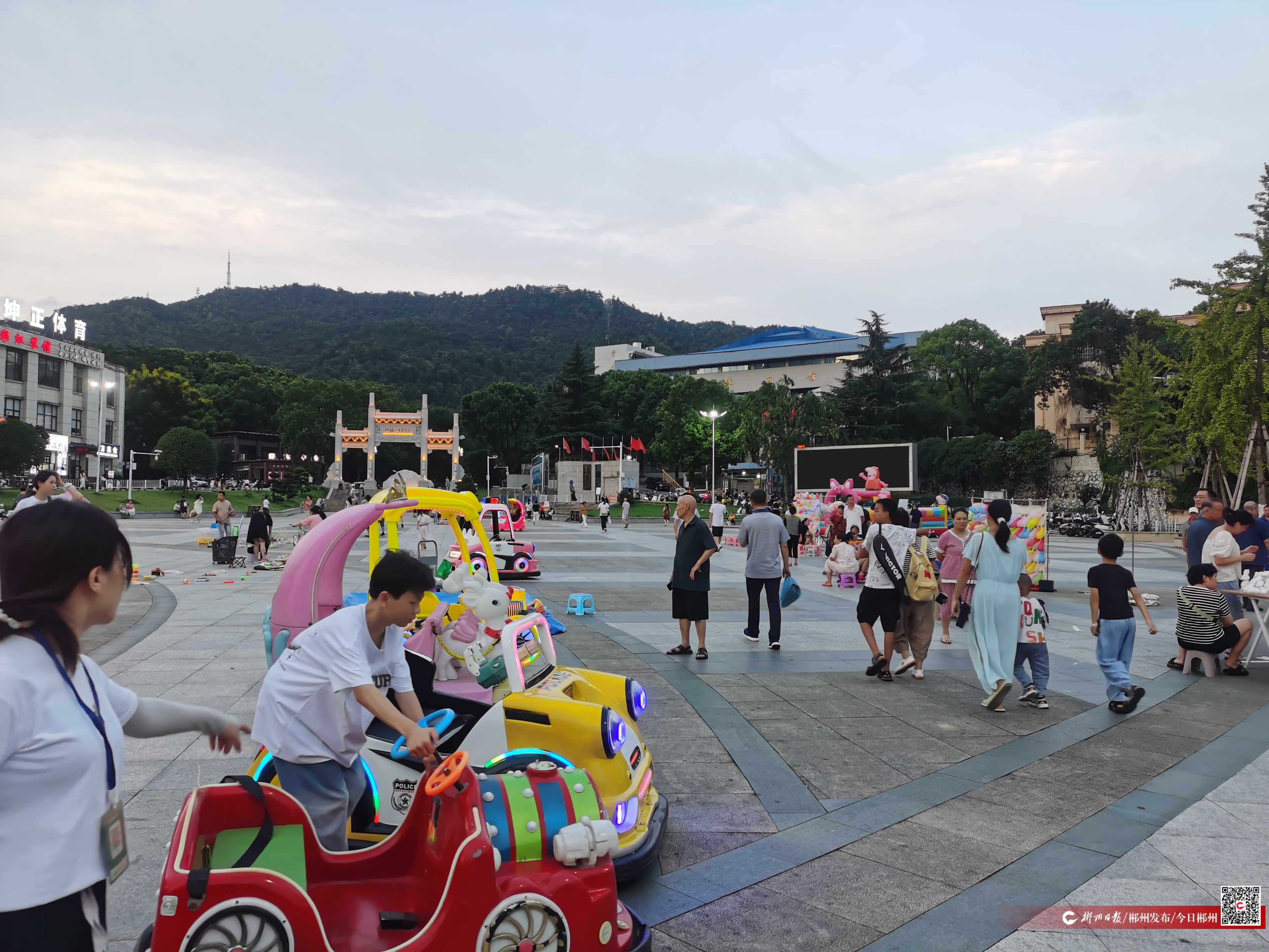 8月27日18时30分,记者在苏仙福地广场看到,广场上人来人往,碰碰车、套圈、打气球等摊位占据在广场中,几名孩童驾驶电动“碰碰车”在人群中穿梭,迫使市民和游客纷纷避让。