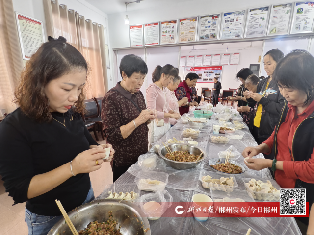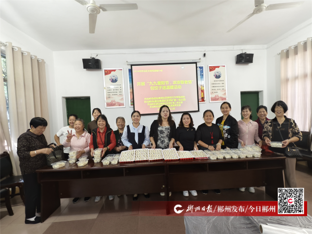 10月11日9时,苏仙区苏仙岭街道白鹿洞社区联合辖区志愿者在社区一楼会议室开展“九九重阳节 浓浓敬老情”包饺子送温暖活动。