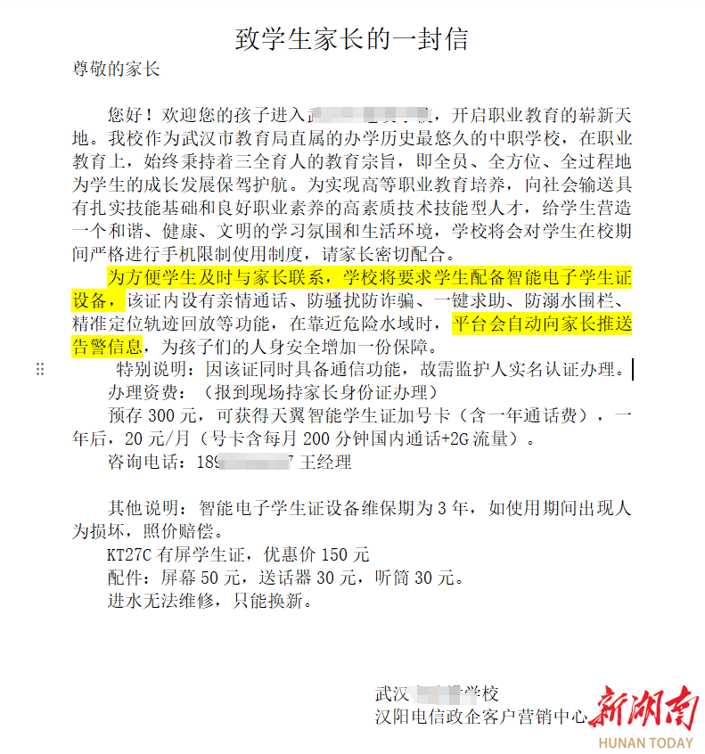 “那个东西不是给你打电话的。”新湖南记者从与该校合作办理此业务的王经理处得知,学校要求学生办理“电子学生证”的主要目的是要“建立一个统一的学生安全监管平台”,当学生位置出现异常时向家长推送告警信息。