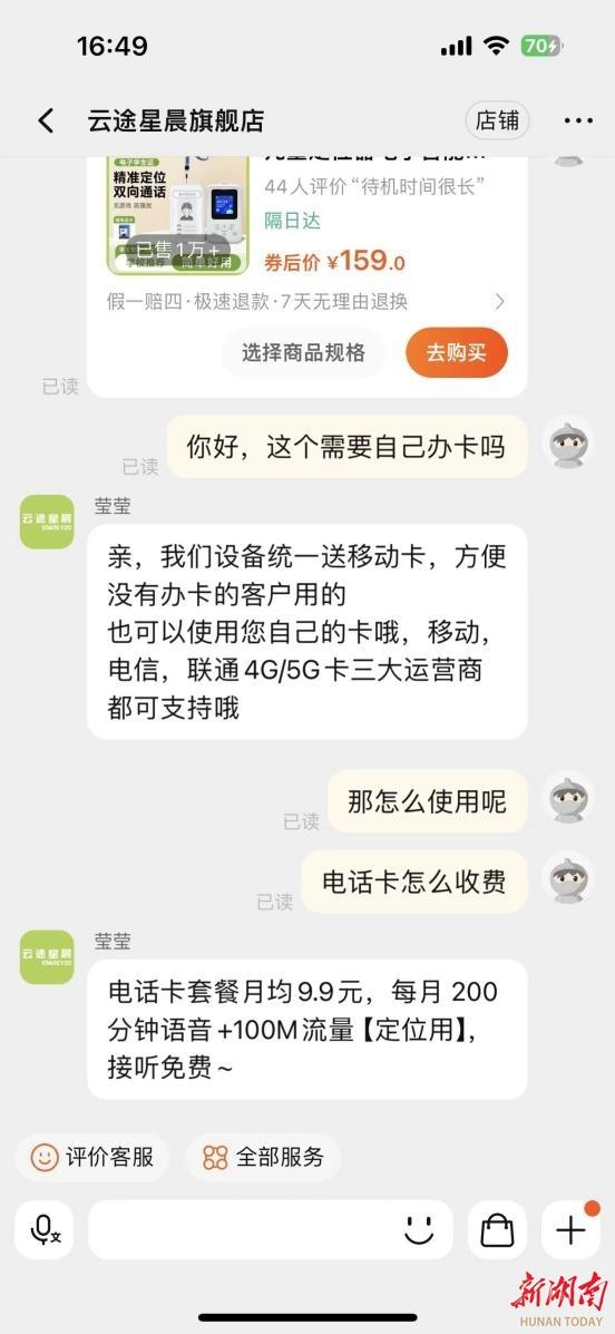 在电商平台上搜索“电子学生卡”,销量排名第一的产品售价159元,同时附赠每月资费为9.9元的套餐,其中包含200分钟语音通话和100M流量(用于定位)。