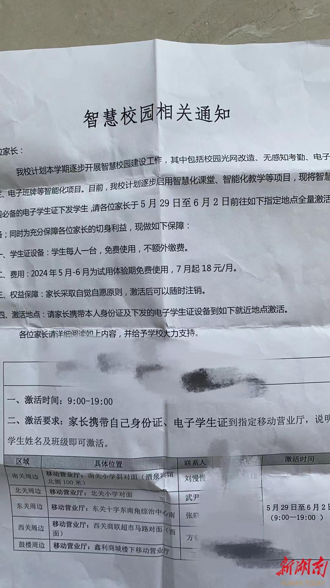 在学校下发的通知中,魏圆得知这个东西叫“电子学生证”,是学校建设智慧校园“必备的”,家长被要求携带本人身份证去指定移动营业厅进行激活,并且需支付18元每月的费用。