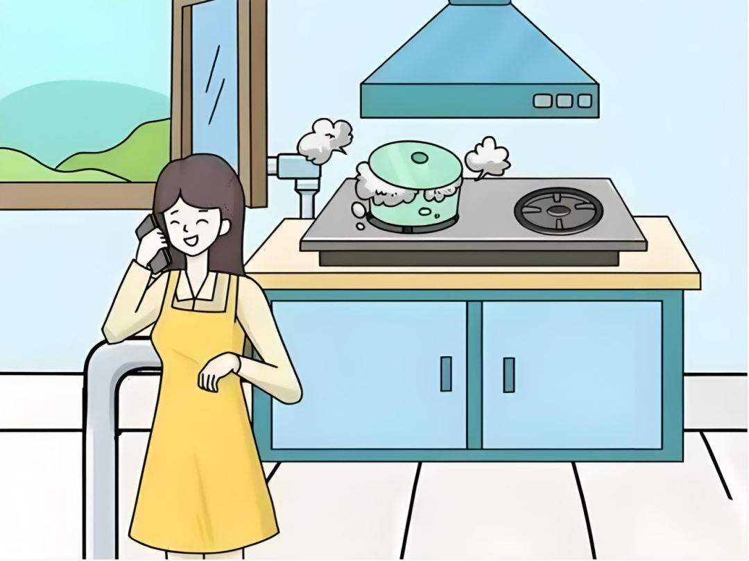 当燃气灶上正在煮东西,千万不要回房间看电视、打电话等,要适时看火,避免汤水溢出、意外熄火等安全事故。