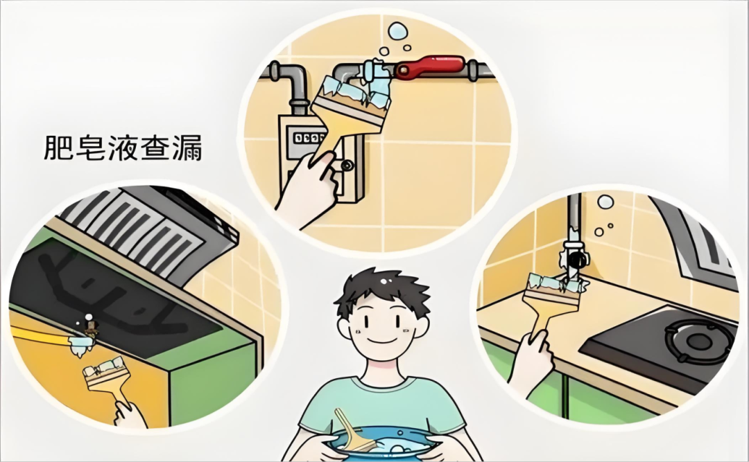 将肥皂水刷在钢瓶角阀、减压阀、胶管和灶具连接处等重点部位,如果冒气泡就说明此处漏气,需立即维修或更换。严禁使用明火检查。