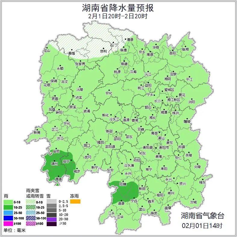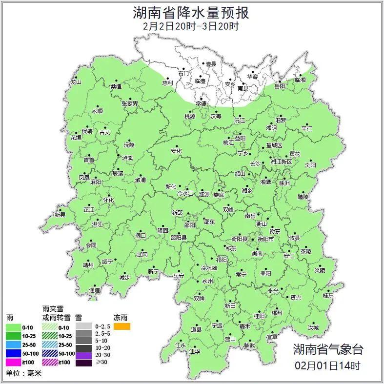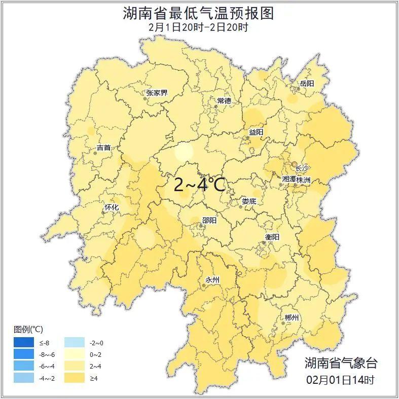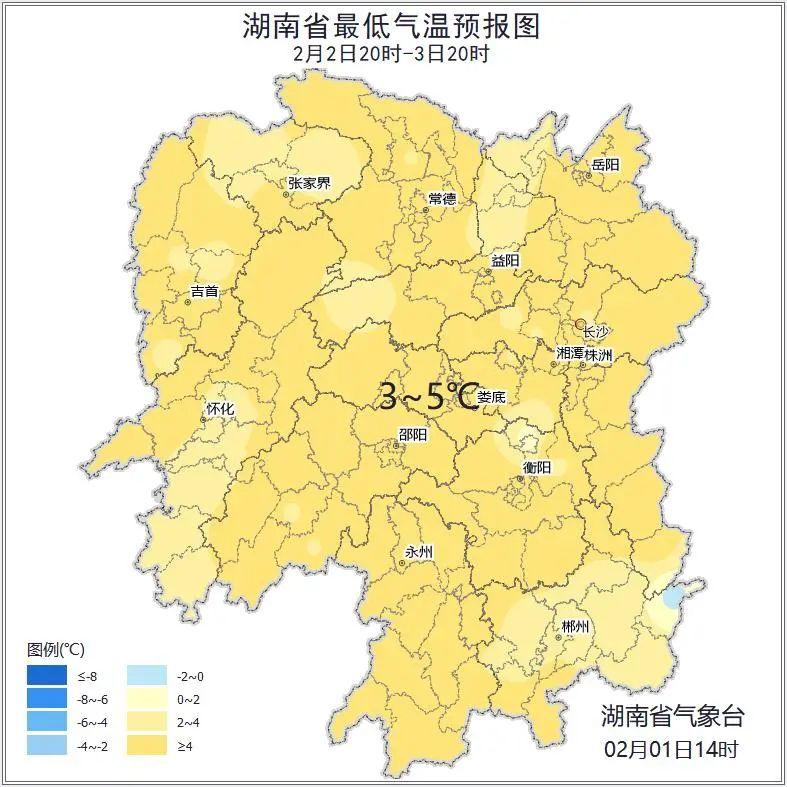 2月2日白天:阴天有小雨,其中湘西南局地中雨,湘西北高海拔地区有雨夹雪或雪;北风3级至4级;最低气温2℃至4℃;最高气温湘南5℃至7℃,其他地区3℃至5℃。
