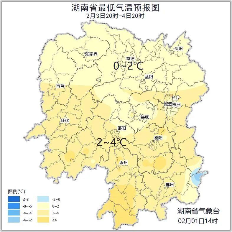 2月3日晚上到2月4日白天:多云到晴天;北风2级至3级;最低气温湘北0℃至2℃,其他地区2℃至4℃;最高气温12℃至14℃。