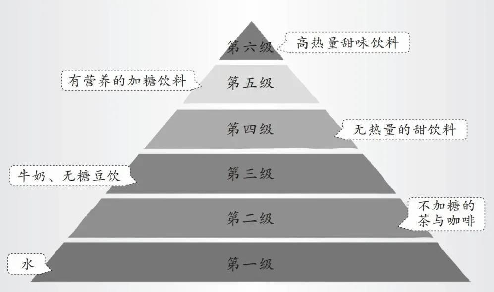 不光健康饮食有金字塔,喝水也有一个“六级”金字塔。在每天的饮水中,最应该多喝的是白水;茶水、牛奶、豆类饮品以及无糖的咖啡,有益健康,应适量摄取;加糖饮料在有需要时可适当饮用,但不是必需品;低营养、高热量的甜味饮料应少喝,更不能代替白水。