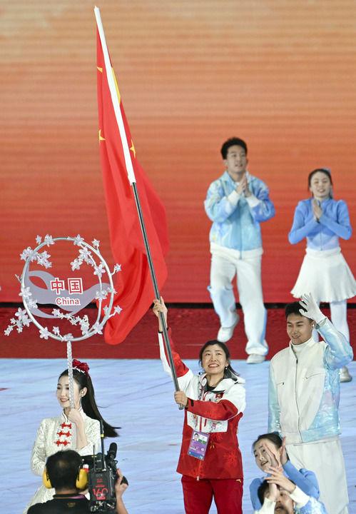 自由式滑雪运动员徐梦桃担任中国代表团的旗手。35岁的她,是中国雪上项目的传奇人物,实现了冬奥会、世锦赛、世界杯等多项大赛的大满贯,成为中国雪上项目首位实现“全满贯”的运动员。在本届亚冬会上,她以 90.94分的成绩夺得女子空中技巧金牌,还带领团队在多个项目中斩获佳绩。她坚韧不拔的精神和卓越的竞技表现,正是中国冰雪运动员的代表。