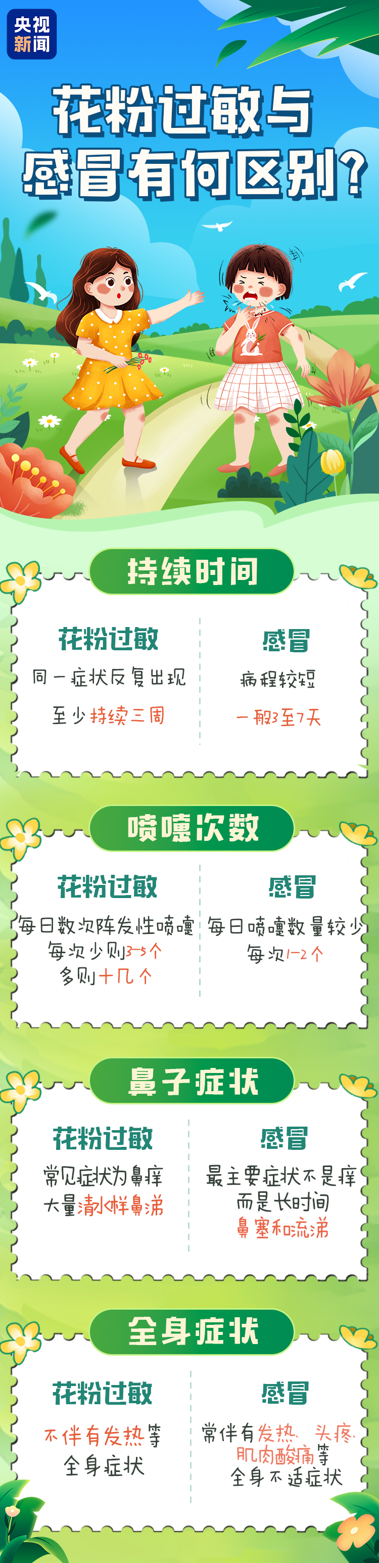 流鼻涕、鼻塞、打喷嚏既是感冒症状,也是过敏症状。花粉过敏和感冒有何不同?一图了解↓