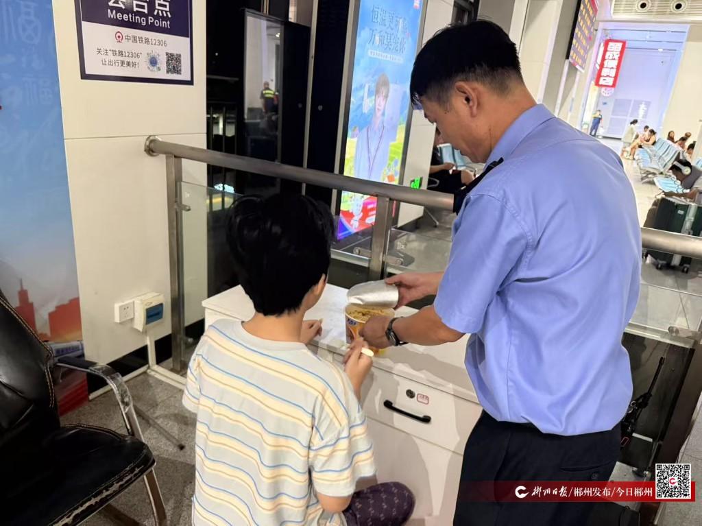 段女士得知儿子在郴州火车站下车后,立即从衡阳驱车赶来。等待期间,王辉始终陪伴在男孩身边,不时与他聊天。得知男孩尚未吃晚饭,王辉还主动送上了晚餐和零食。当天23时许,段女士顺利接到了男孩。