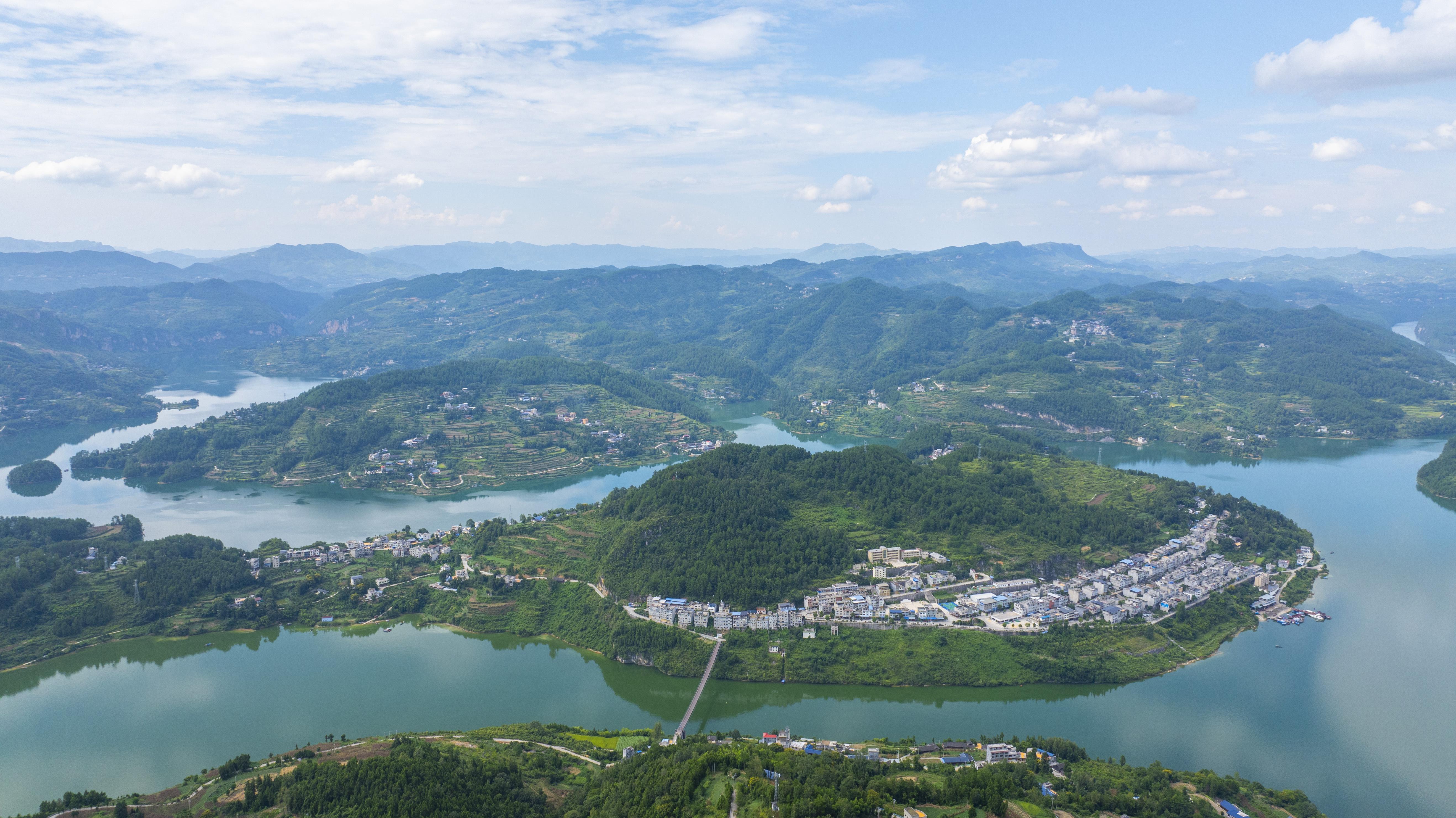 傍晚时分,站在周寨村村委会办公楼顶远眺,一眼望不到边的红薯基地像一块翠绿的地毯,铺在山间;现代化工厂的玻璃幕墙映着晚霞,泛着暖融融的光;远处的乌江波光粼粼,夕阳洒在水面上,美得像一幅画。