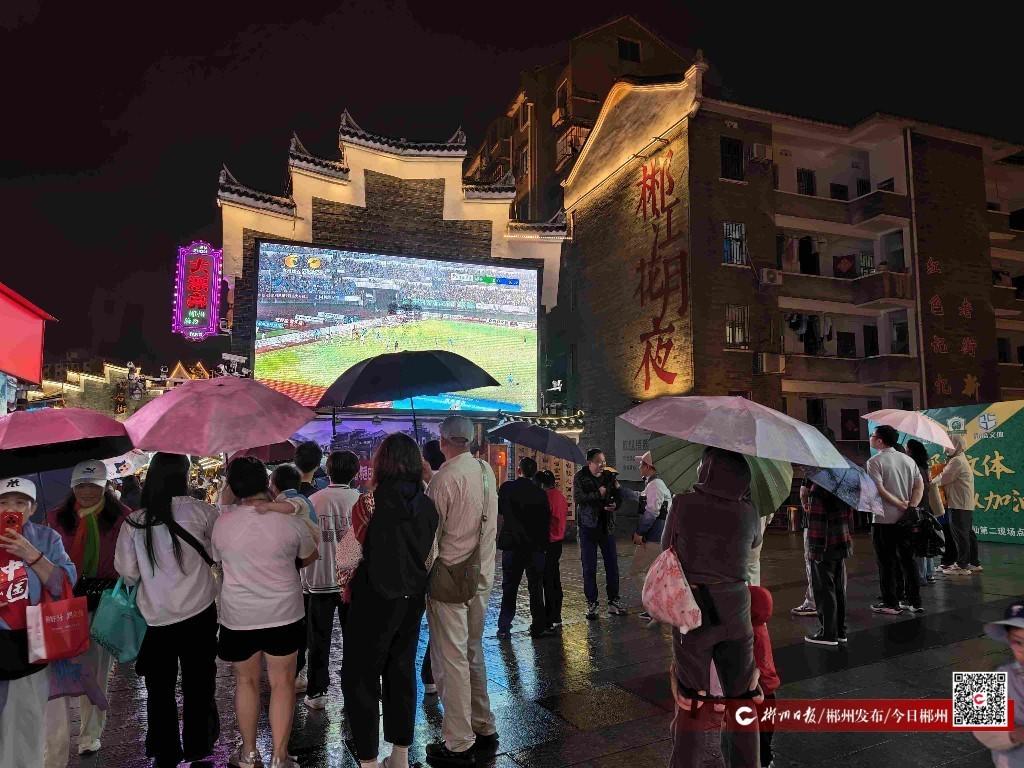 9月20日晚,郴州体育中心灯火如昼,“湘超”联赛郴州主场迎战长沙队的较量正式打响。绿茵场上,球员们奔跑拼抢的身影牵动人心,而第二观赛现场之一的裕后街牌坊广场,赛事的热度同样蔓延到这里,烟火气与欢呼声交织成独属于郴州的“足球夜”。