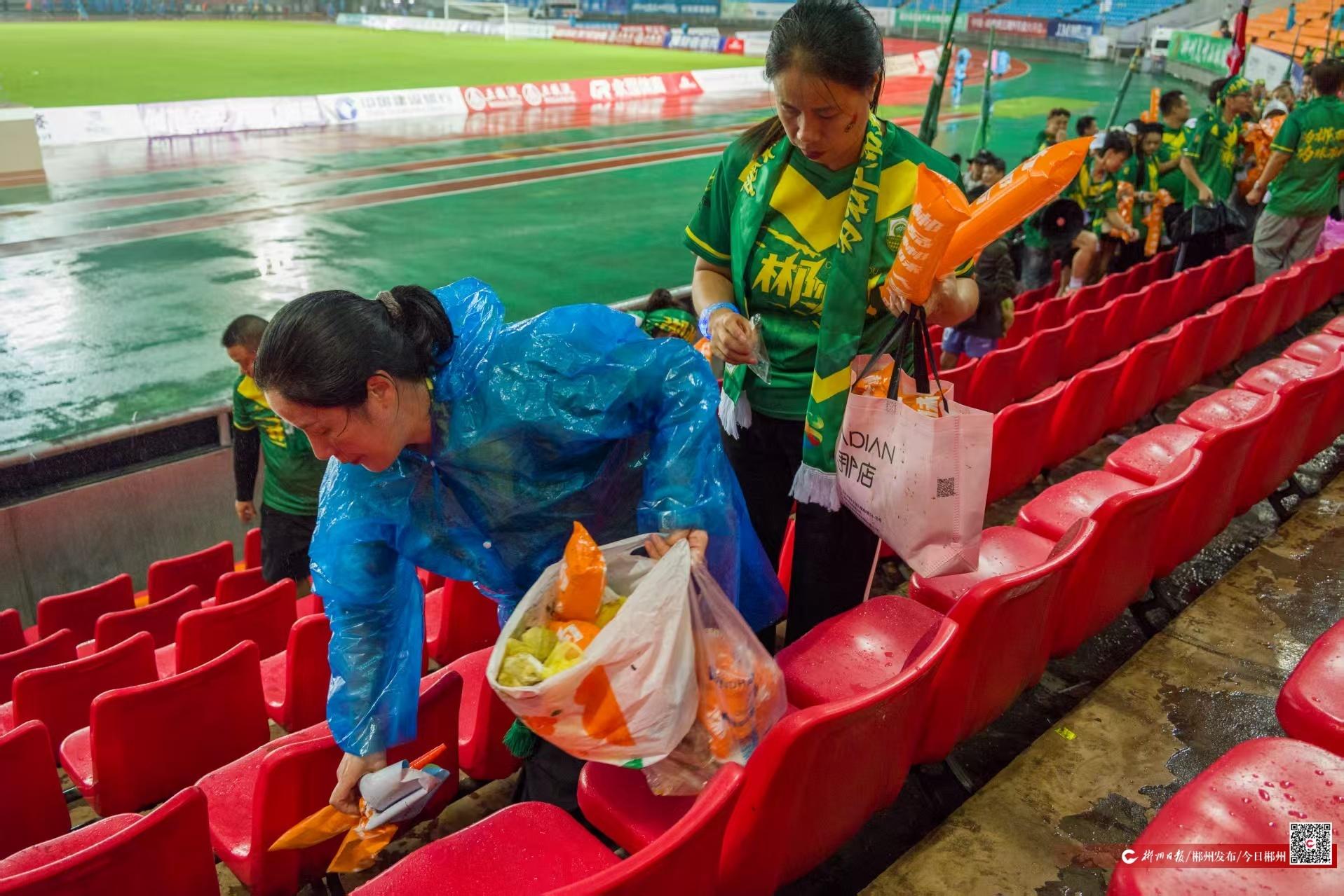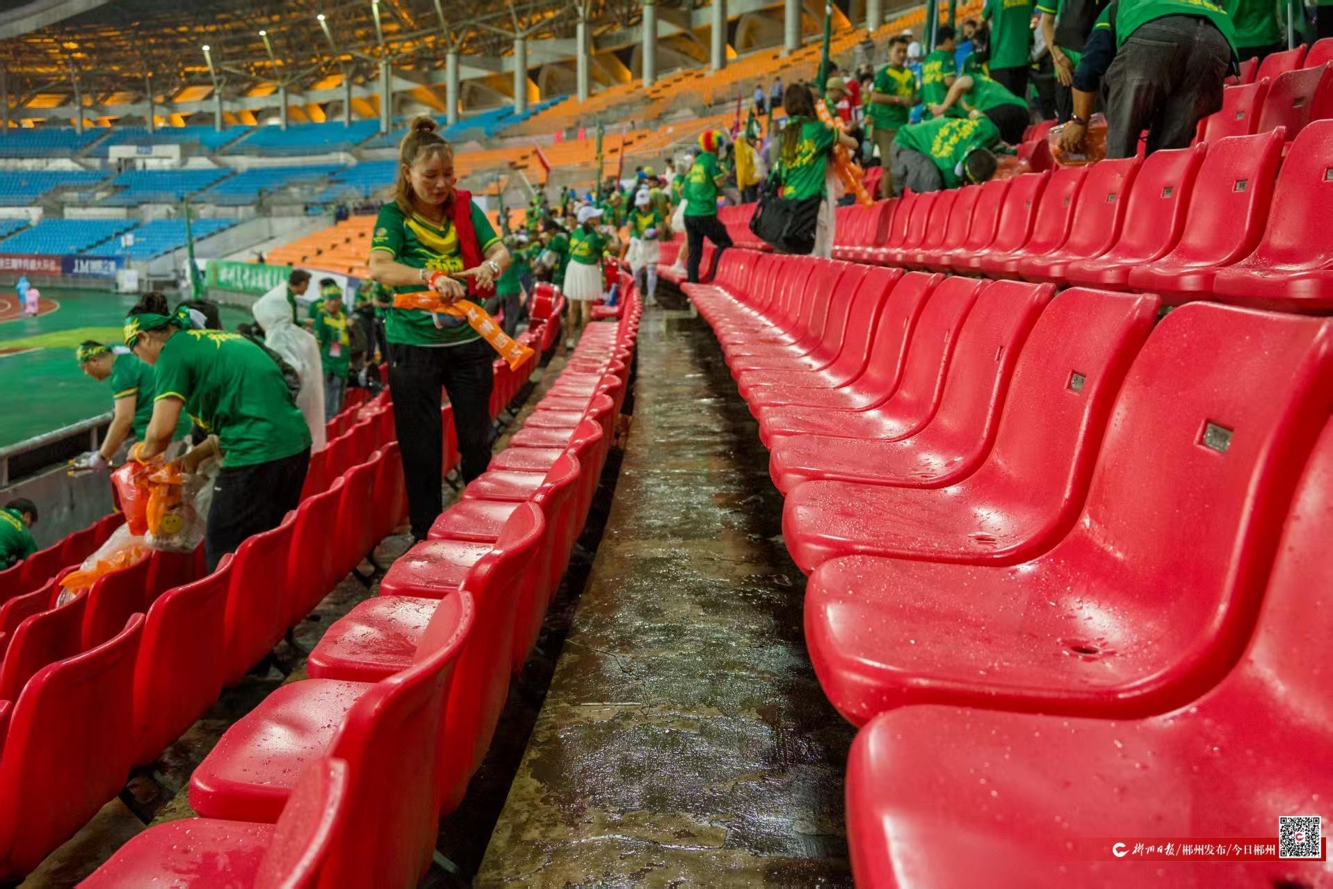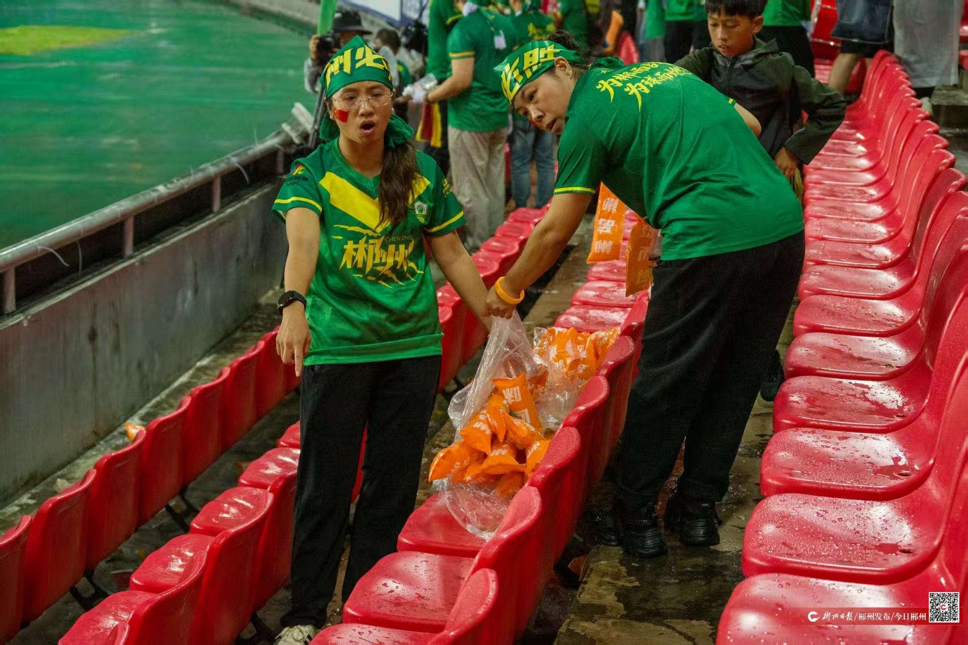 球迷们在离场前主动清理看台,将垃圾装入自备的塑料袋中。“要把座位收拾干净再走。”一位带着孩子的女球迷边捡垃圾边叮嘱孩子。