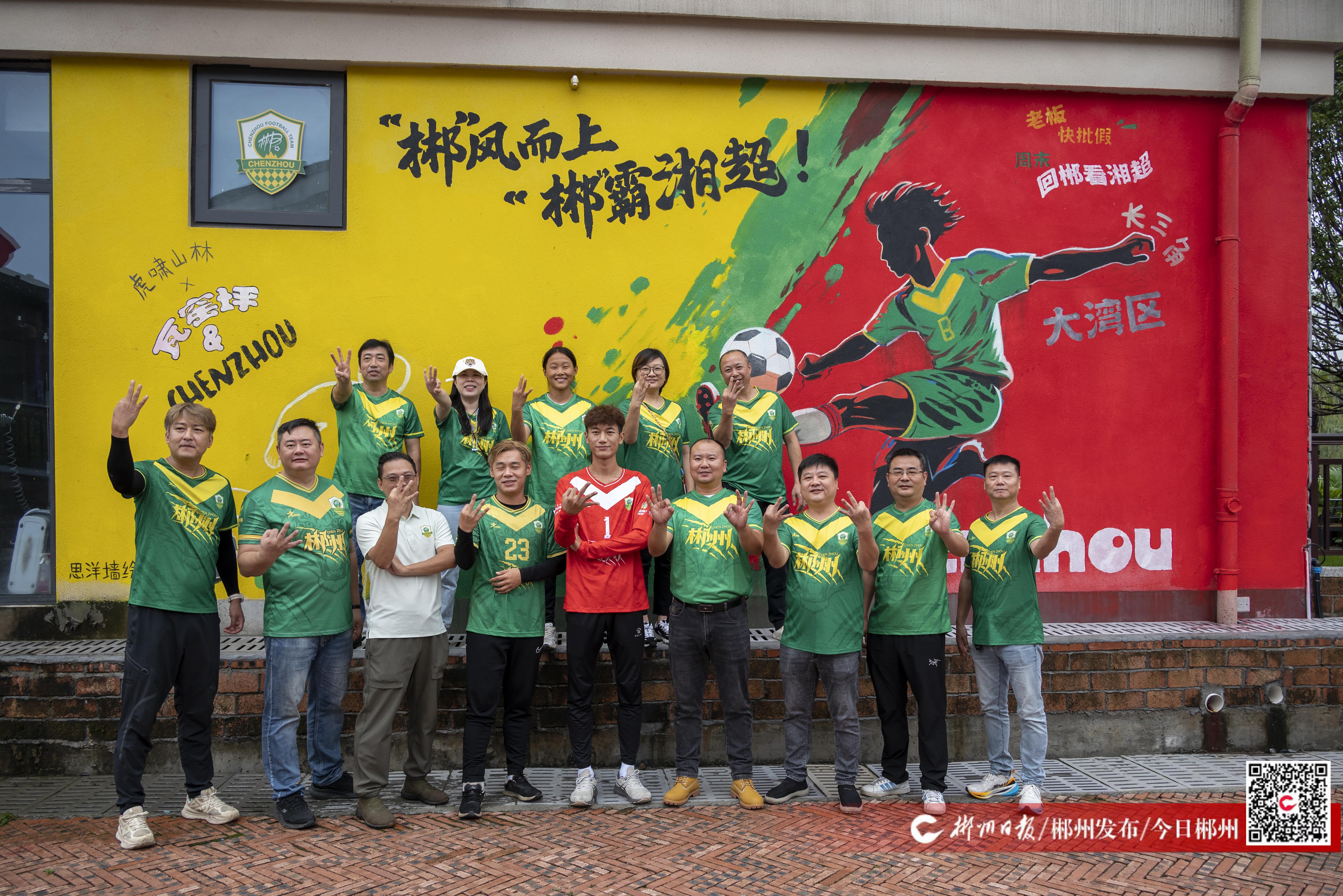 9月25日上午,即将出征客场的“湘超”郴州队队员代表与球迷代表齐聚苏仙区瓦窑坪历史文化街区,在一幅专为球队创作的墙绘前合影“打卡”,为队伍助威。