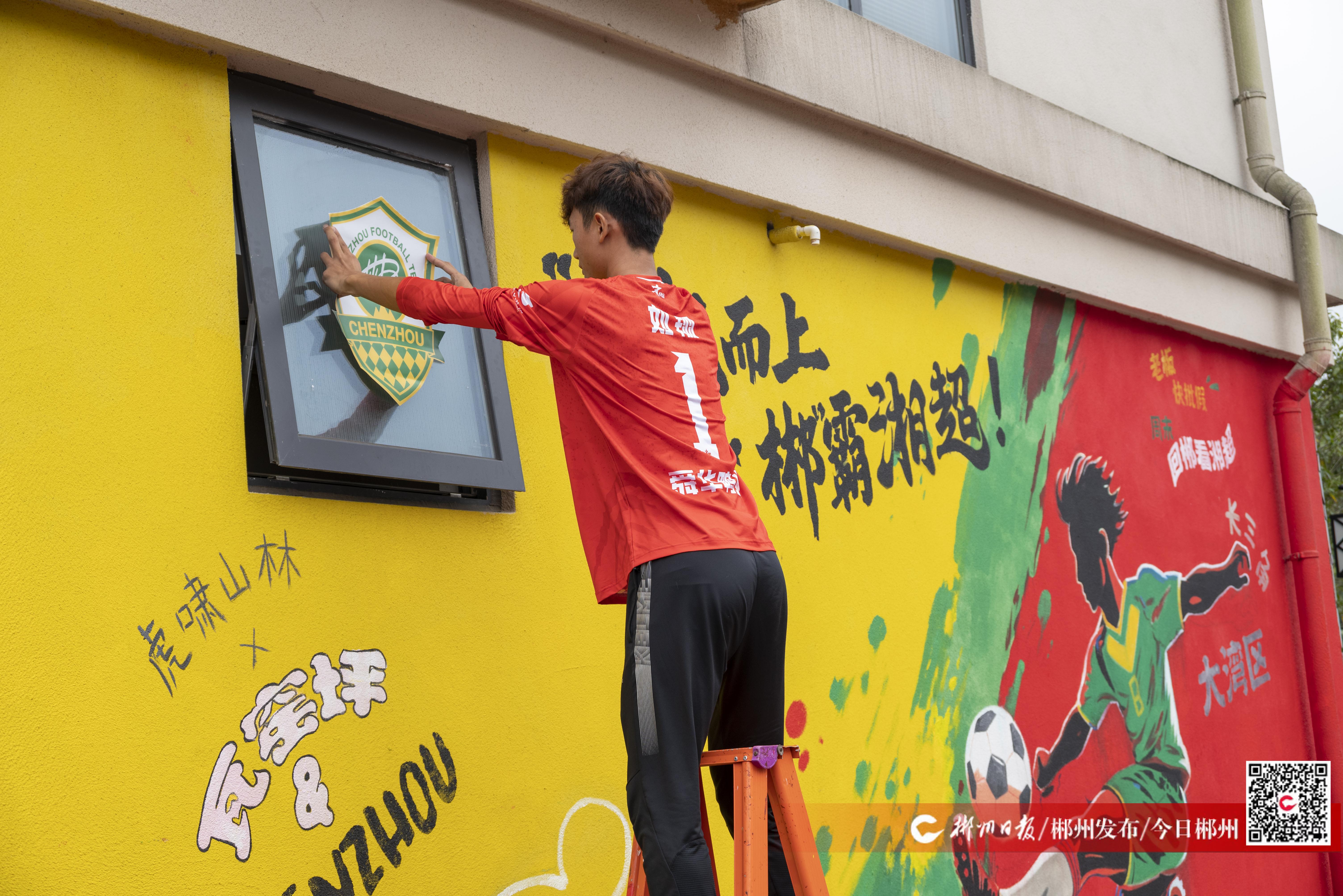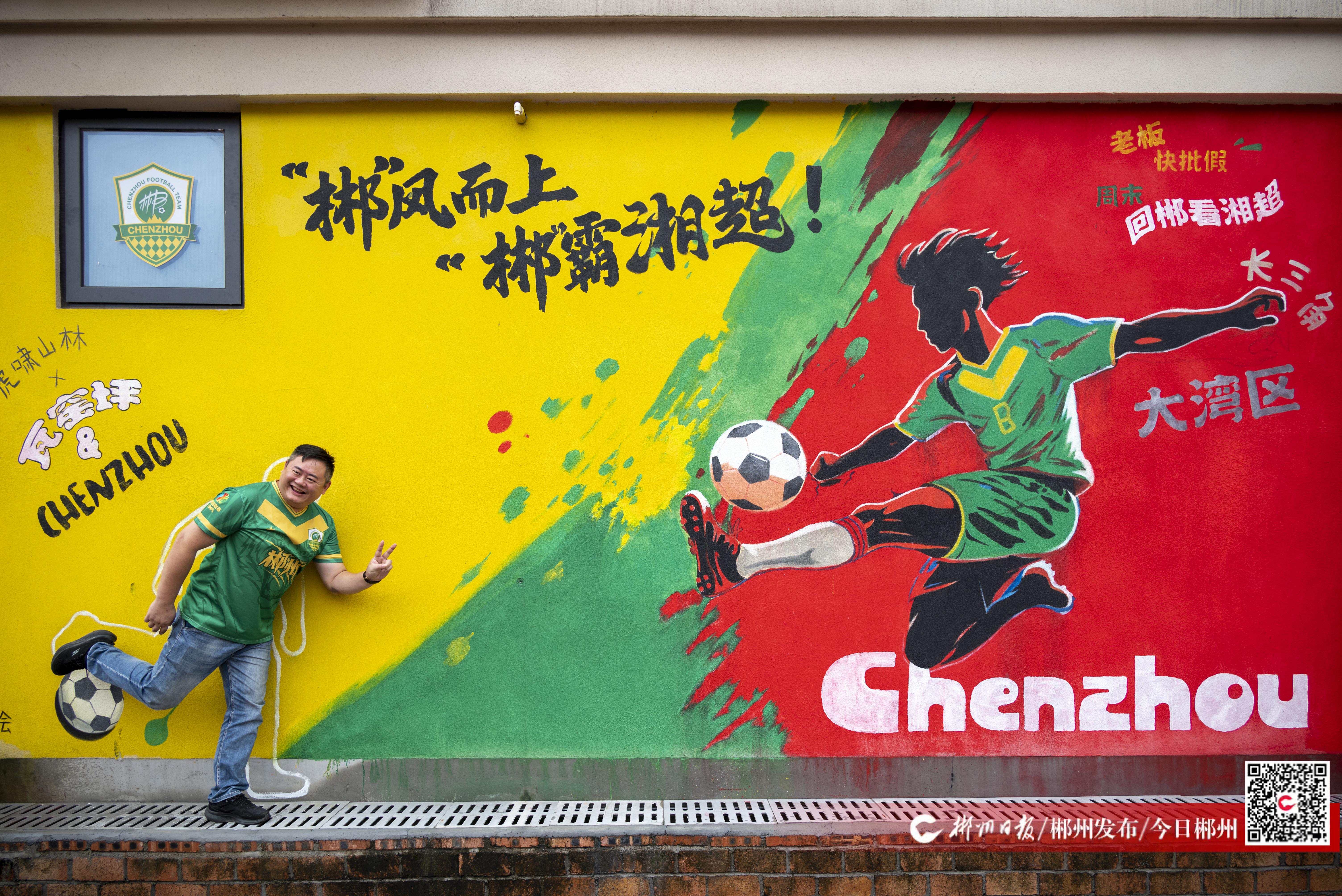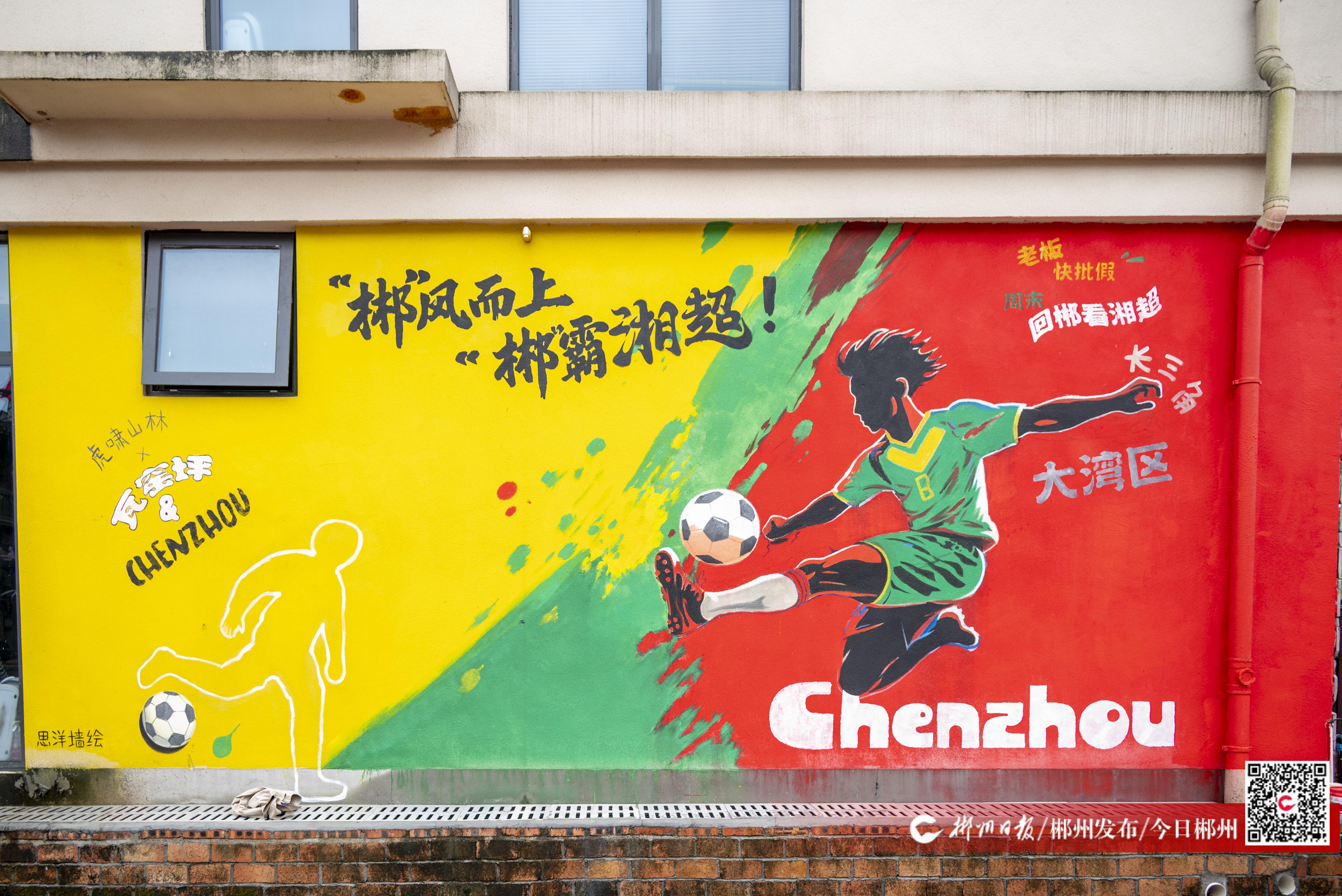 这幅题为《“郴”风而上,“郴”霸湘超!》的墙绘位于翠江畔,由本地“90后”墙绘师李思洋创作。画面以球员凌空抽射的剪影为主体,搭配鲜明的助威口号以及“老板快批假,回郴看湘超”等趣味标语,动感十足。整幅作品运用红、黄、绿等高对比色彩,结合泼墨式笔触,生动传递出绿茵场上的速度与激情,也与周边丹霞山水景观形成巧妙呼应。