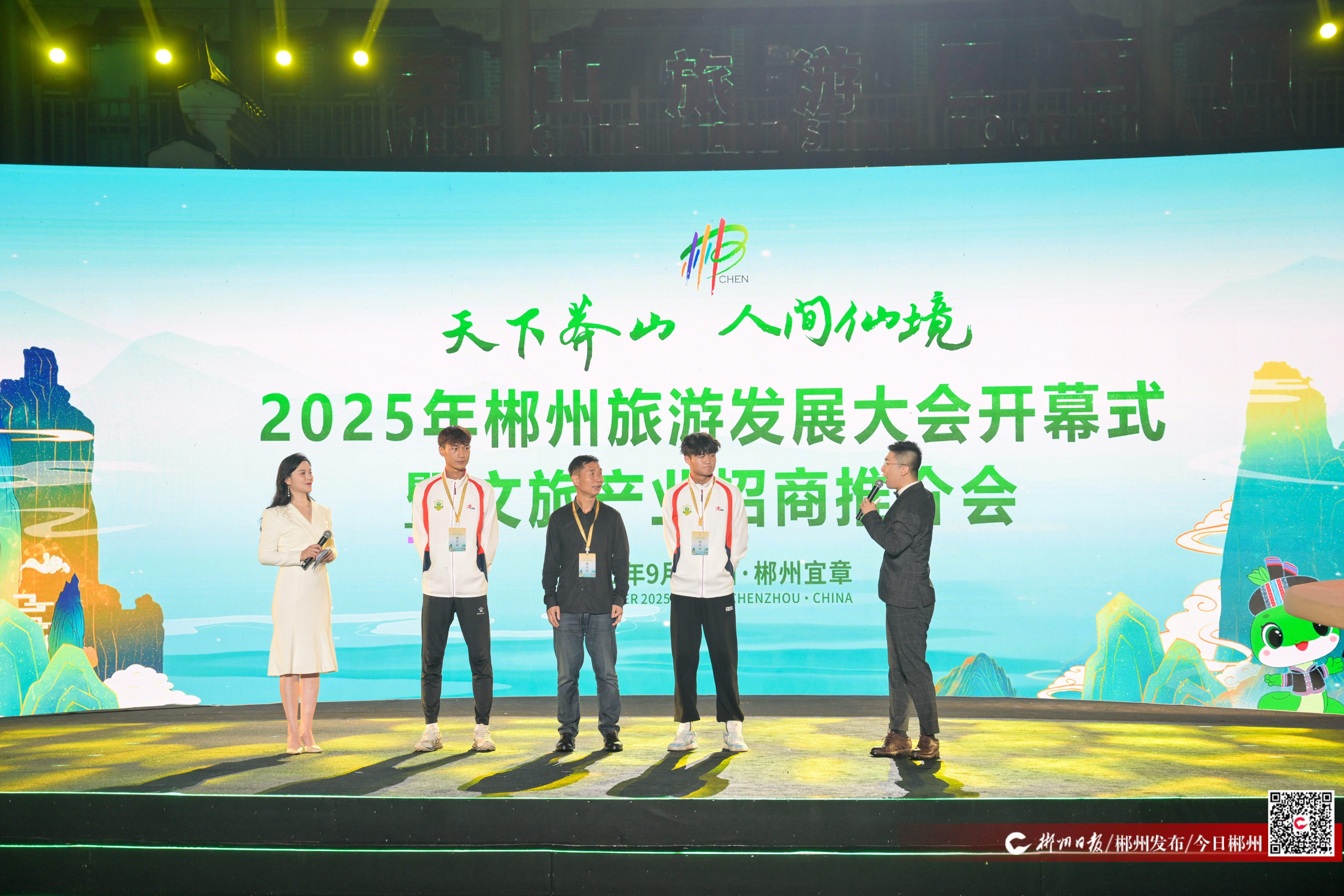 9月25日晚,2025年郴州旅游发展大会在宜章县莽山国家森林公园开幕。湘超郴州队主教练陈强携队员刘翔、谭懿亮相开幕式现场,与观众热情互动,为次日客场挑战益阳的比赛助威造势。