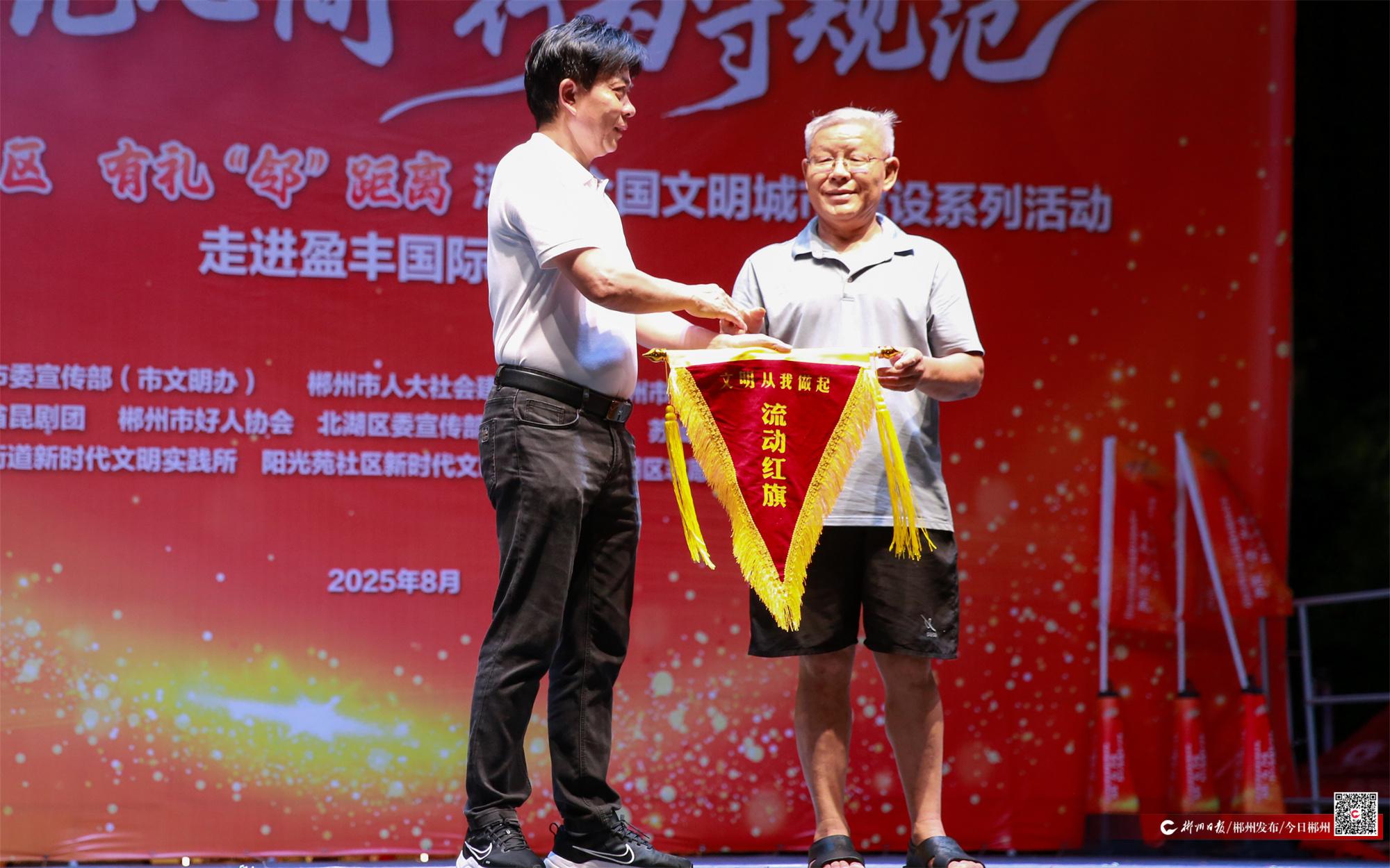当盈丰国际小区党支部书记黄永雄将旗帜交到苏仙区王仙岭街道苏园翰庭小区党支部书记曹三明手中时,这面旗帜的传递,象征着文明接力棒的延续,更是一种“我们小区也能办好”的公开承诺,激励着每个小区都成为文明创建的主角。它鼓励居民从旁观者变为参与者,甚至主导者,将陌邻转化为睦邻,从而接力推广文明治理模式。