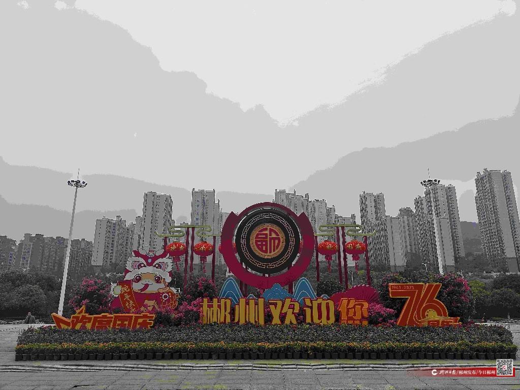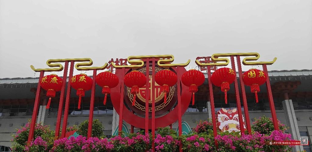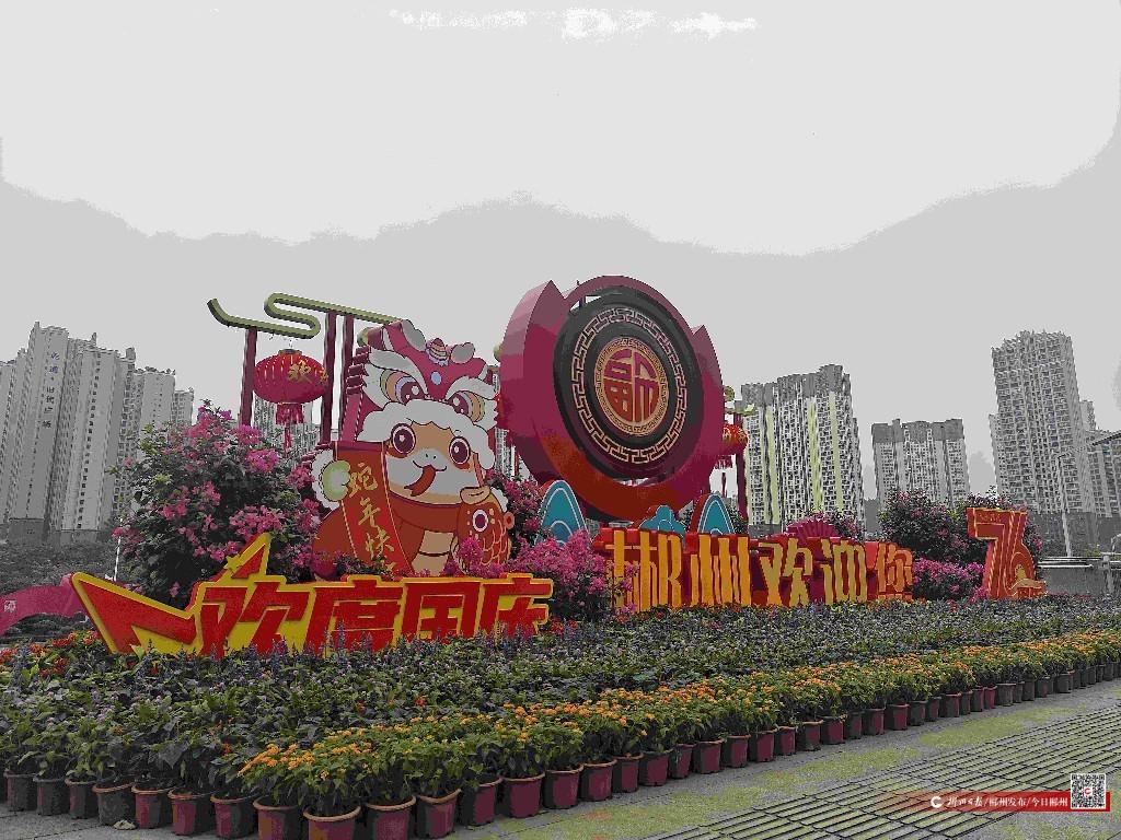 在郴州西站,城市道路绿化队以“欢度国庆”和“郴州欢迎您”为主题,用鲜艳的红色和黄色立体字表达了对祖国的热爱和对游客的热烈欢迎。花坛中央,一个巨大的“福”字装饰,寓意着对祖国和人民的美好祝福。