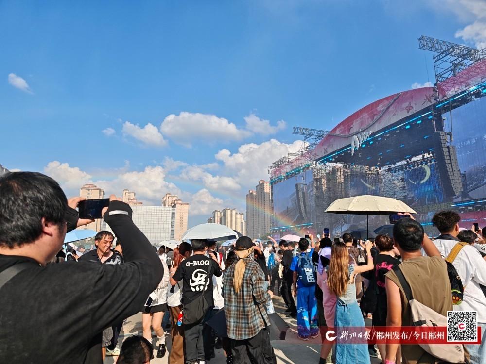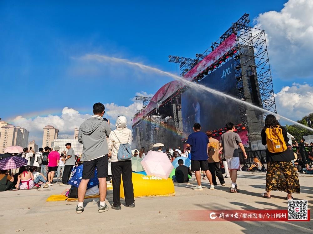 10月3日,2025AYO!音乐节郴州站热力开唱。现场骄阳似火,但高温天气并未消减乐迷热情。为缓解乐迷燥热、提升观看感受,工作人员开启现场喷水模式,水雾与阳光交织形成绚烂彩虹,让“虹”运与音乐一同陪伴在场观众。