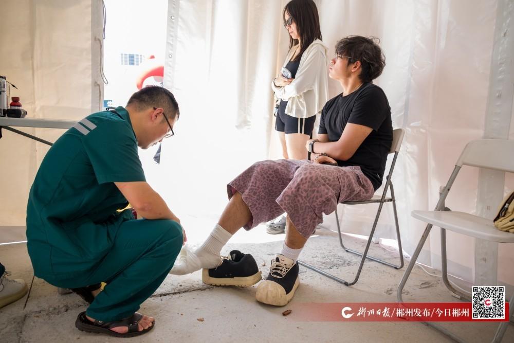10月3日,在音乐节现场的医疗点,市第一人民医院院前急救科的医师陈意祥正在为一位感到脚痛的乐迷进行治疗。“先进行冰敷,再用绷带包扎,随后根据情况决定下一步治疗”。