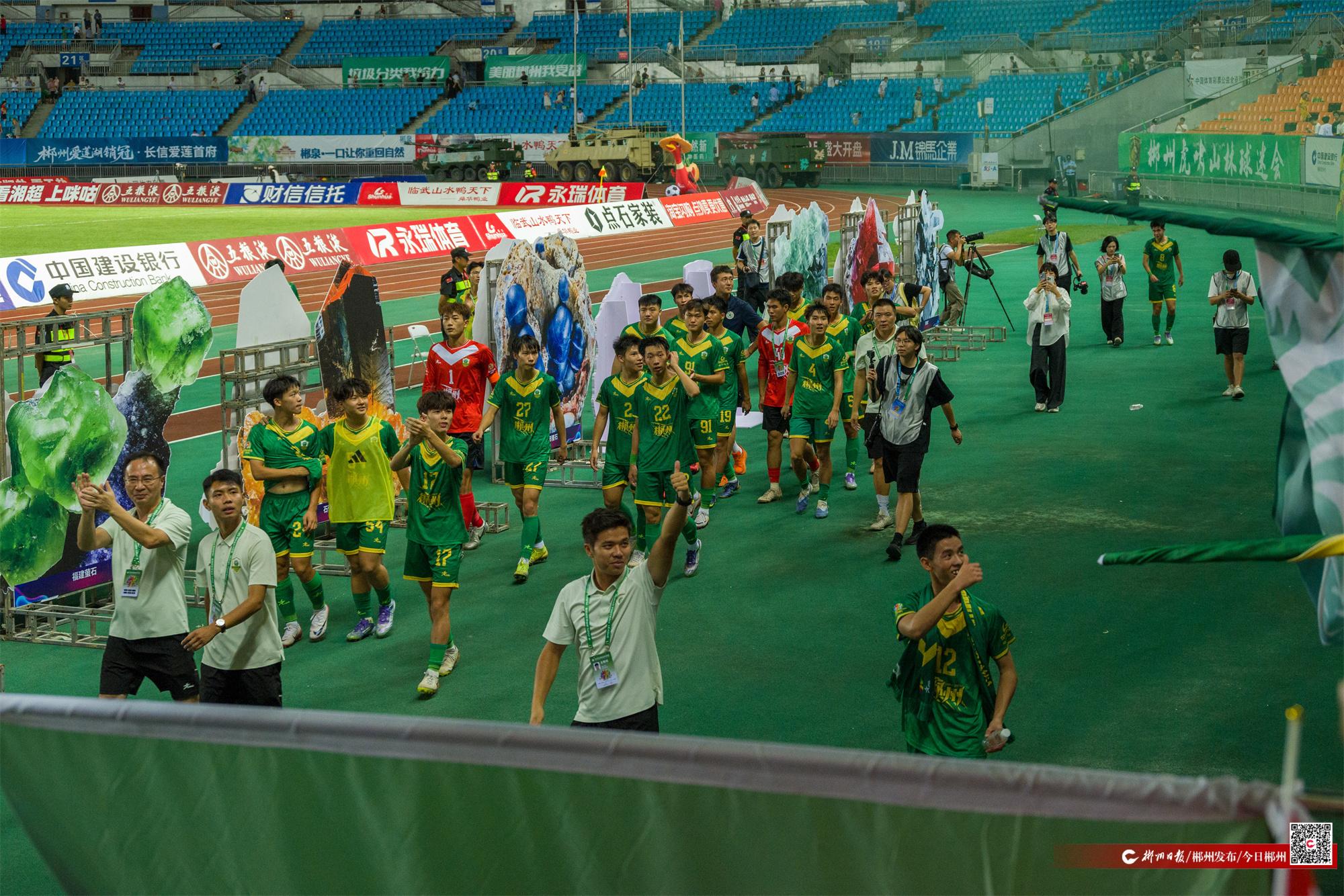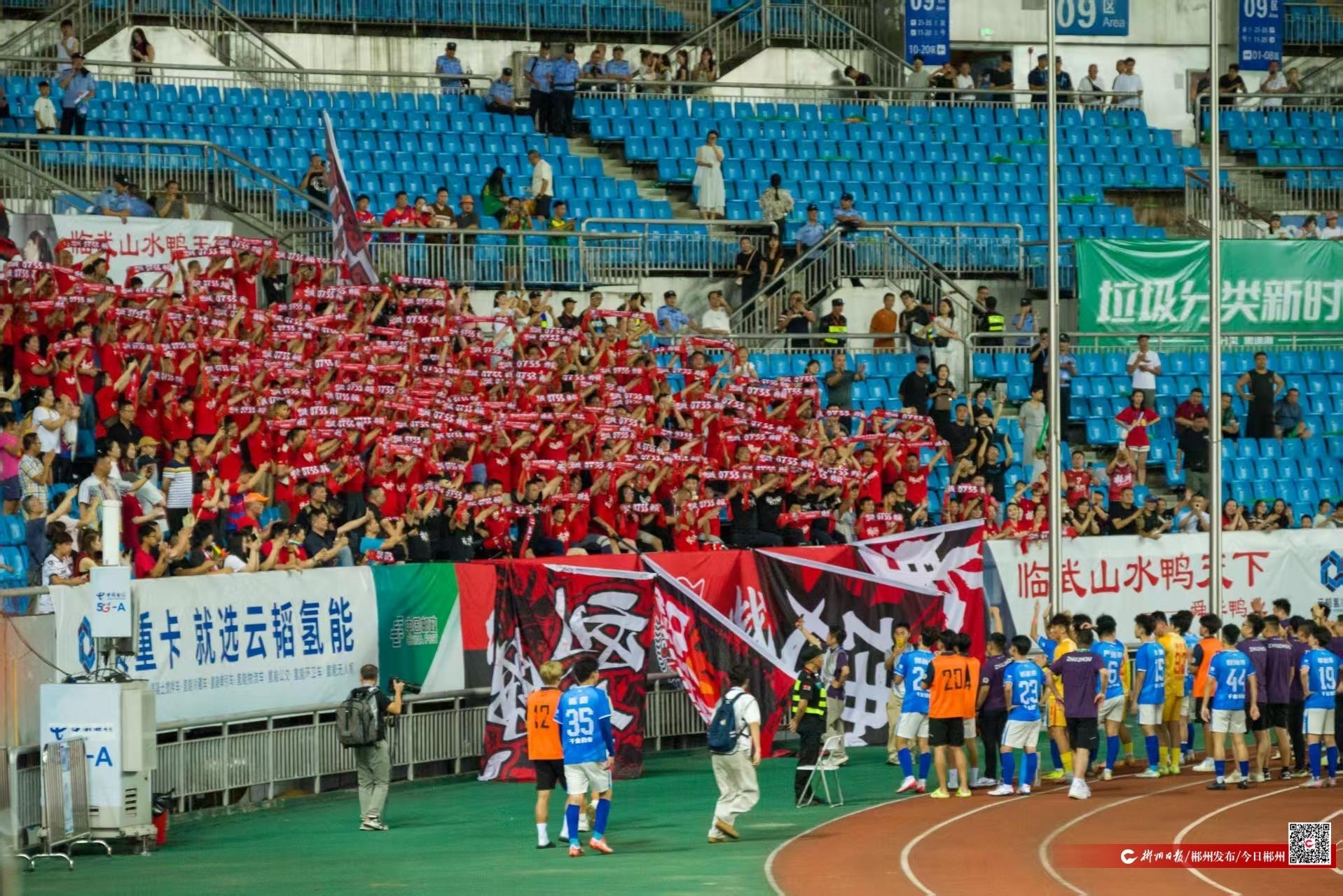 10月5日,“湘超”联赛郴州队主场与株洲队1比1战平。赛后,双方全体队员绕场至看台边向现场观众致谢。客队行至主队看台时,主队球迷高喊“株洲你好”“感谢株洲”。主队行至客队看台时,株洲助威团也热情回应“郴州加油”。场上握手言和,场下友好互动,展现了足球赛场超越胜负的体育精神。