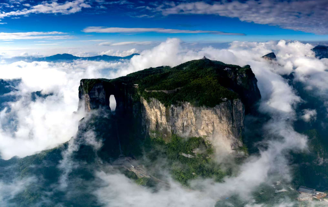 与之遥相呼应的,是张家界天门山的险峻奇绝。天门洞开,云海翻涌,九十九弯山路如游龙盘绕,玻璃栈道悬空而立,翼装飞行破风而行——那是挑战极限的胆识,是英武不凡的气场。