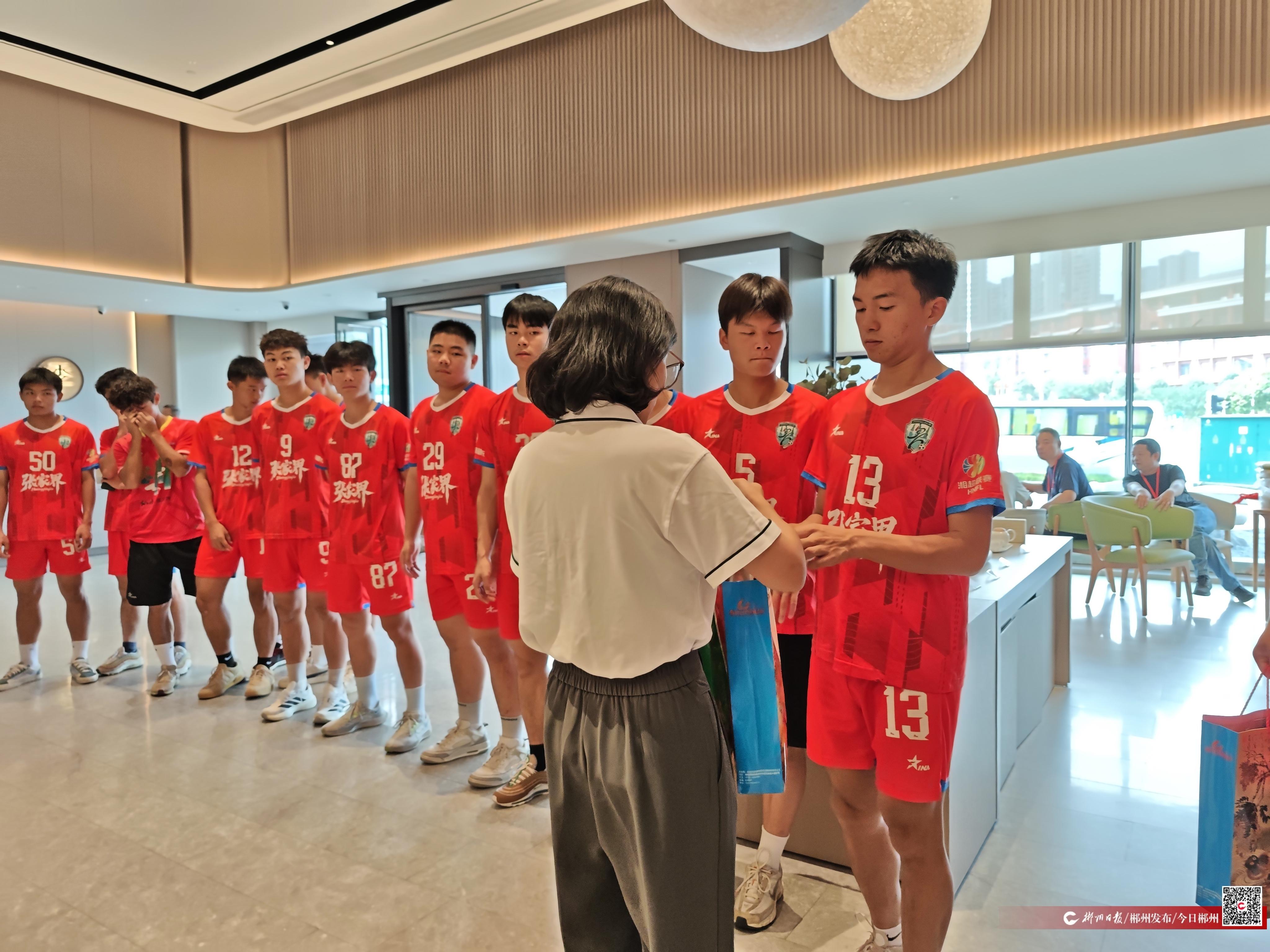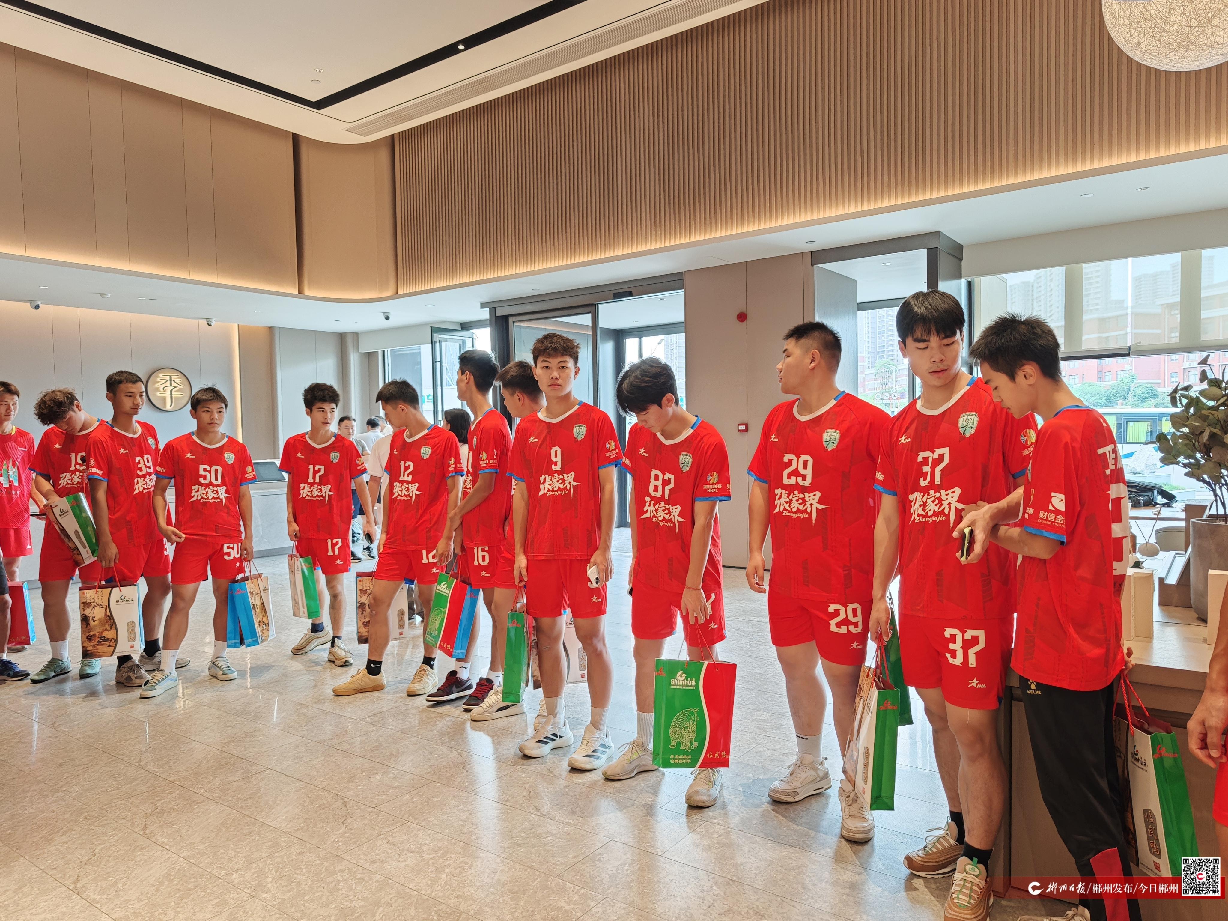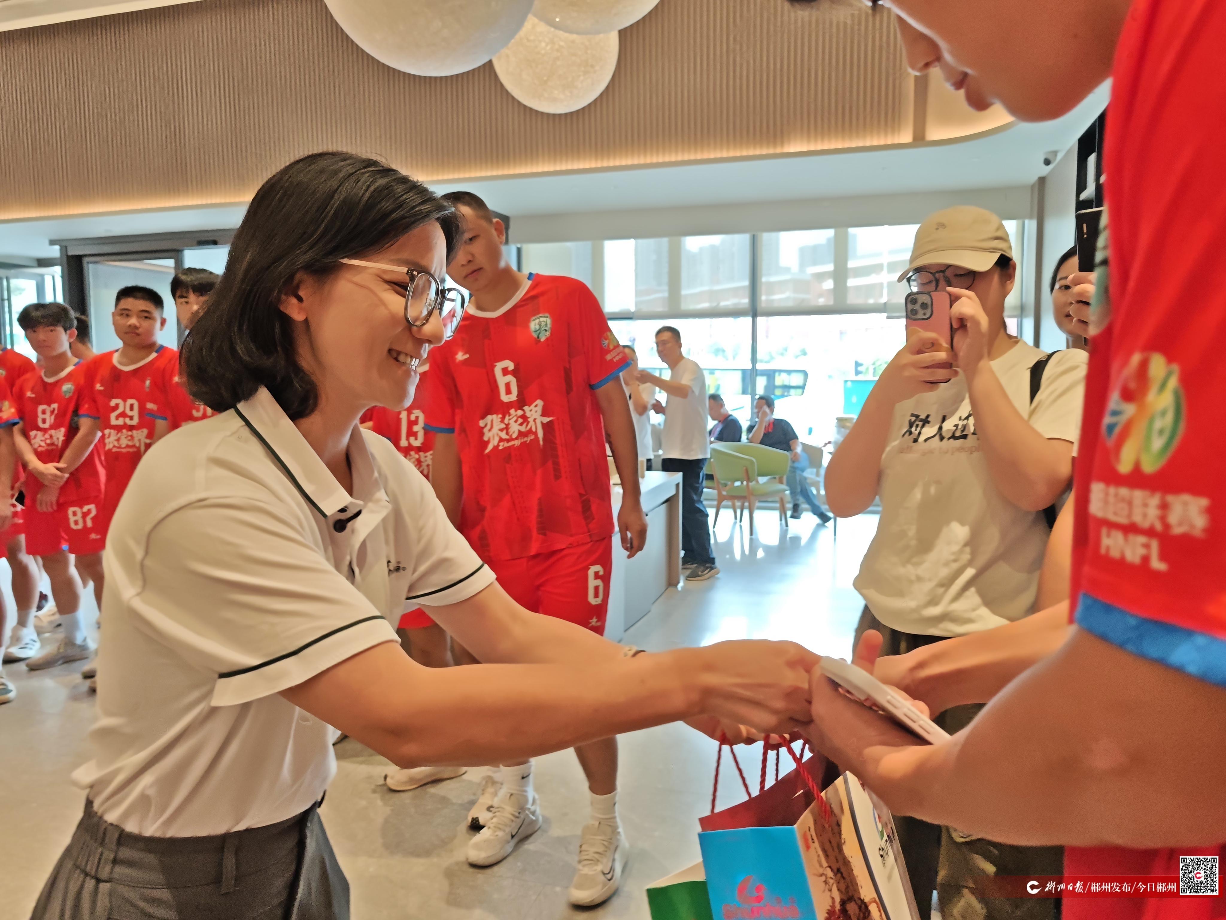 “这是我们郴州的特色美食舜华临武鸭,希望能够让大家感受到我们郴州人民的热情,也希望你们能把我们郴州的味道带回你们的家乡张家界。”10月11日中午12时许,湖南临武舜华鸭业发展有限责任公司工作人员正热情地为远道而来、客场作战的张家界队送上他们精心准备的特色伴手礼。