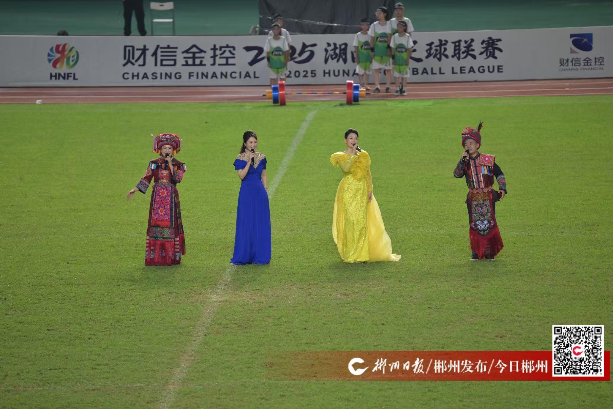 灯光流转,旋律轻起。文旅歌曲串烧《我在郴州遇见你》《走进莽山》《东江湖上摆歌台》依次上演,为火热赛场注入一股清新之风。一曲以温柔旋律道出城市温情,引人遐想赛后漫步东江畔的闲适;再一曲以雄浑旋律带领听众走进莽山秘境,体验一段“洗肺之旅”;第三曲则勾勒出“渔舟唱晚”的意境,邀观众在赛事间隙领略“雾漫小东江”的诗意。三首歌串联起郴州最具魅力的人文山水,传递出“看完‘湘超’,游遍郴州”的诚挚邀请,展现“体育+文旅”融合的广阔前景。