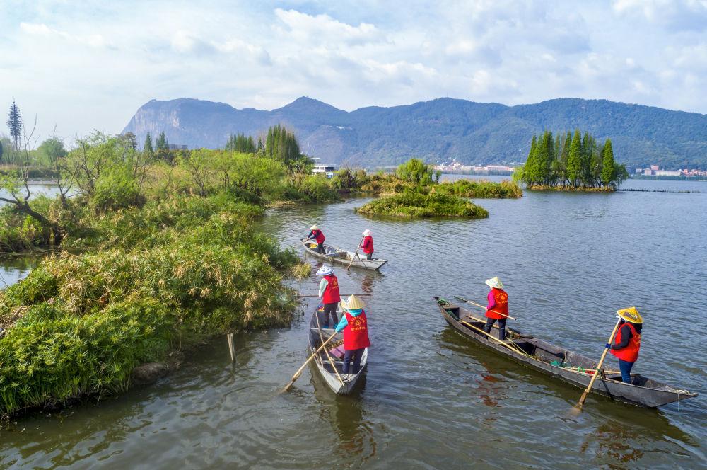 2023年3月20日,巾帼打捞队队员在云南昆明滇池草海打捞水草(无人机照片)。在云南昆明滇池边,活跃着一支由当地妇女组成的巾帼打捞队。数十年来,她们驾驶船只打捞滇池及周边入湖河道、湿地的垃圾、杂草等。