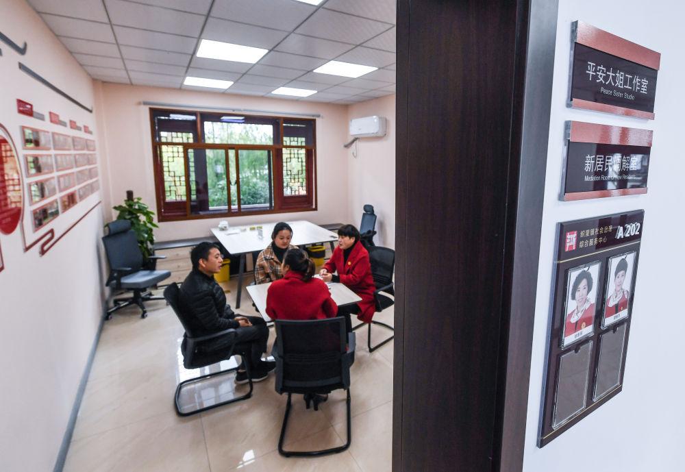 2019年11月29日,在浙江省湖州市织里镇社会治理综合服务中心调解室,“平安大姐”工作室的志愿者调解纠纷。“平安大姐”团队运用中华优秀传统文化中的“调解”思维,依靠亲情、友情、乡情“说和调停”,调解纠纷,化解矛盾。