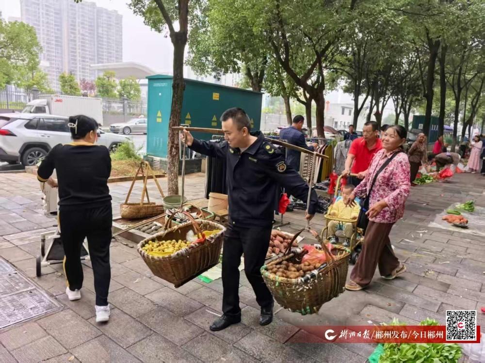 ▲城管执法人员柔性执法,对进城占道卖菜农民教育劝导,帮助农民将菜挑至市场内指定地点销售