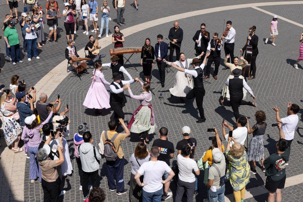 ▲6月14日,为庆祝首个文明对话国际日,“对话·知音”文明对话国际日主题活动在匈牙利首都布达佩斯举行。图为中匈艺术家在城市快闪音乐活动上表演。新华社发(弗尔季·奥蒂洛 摄)