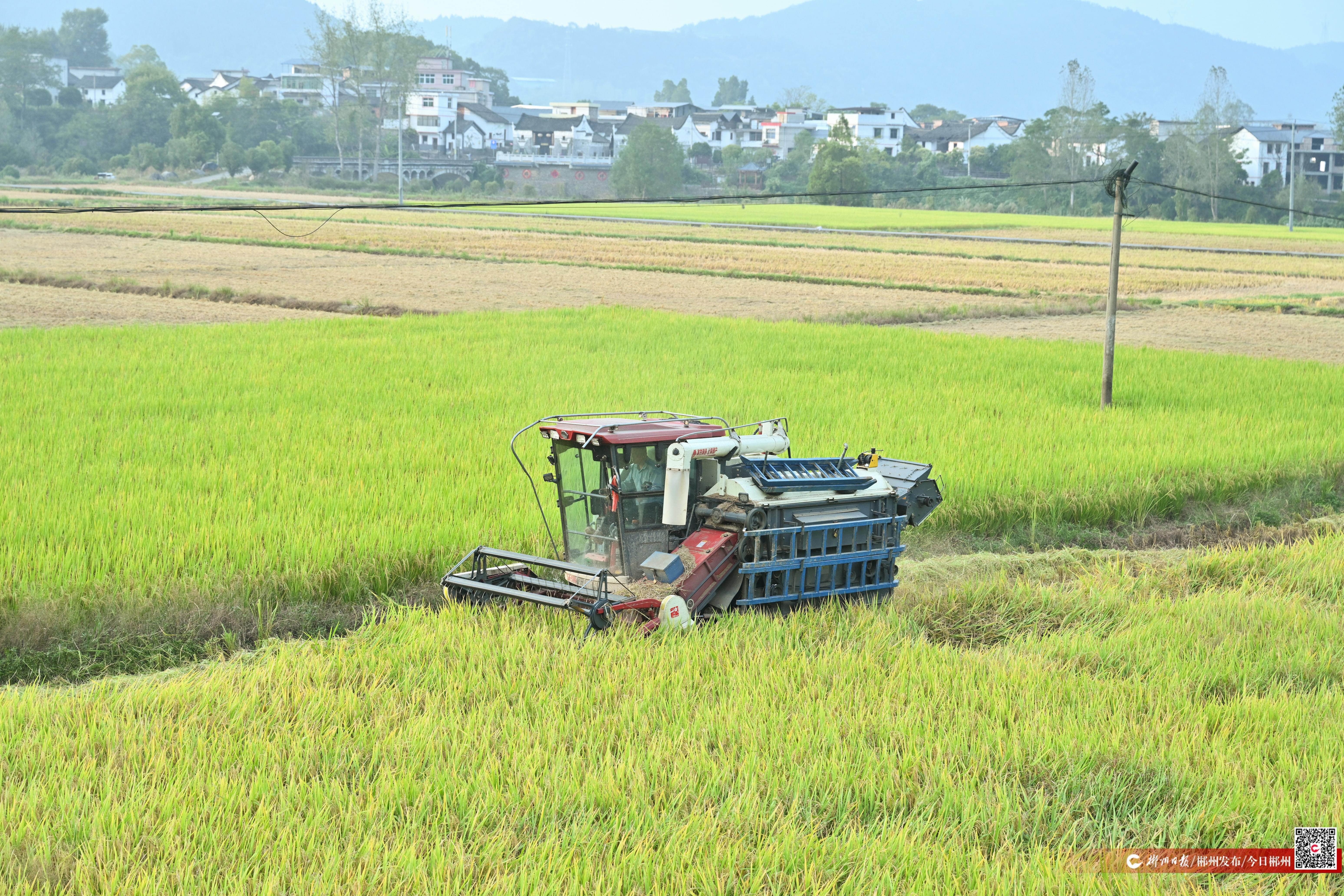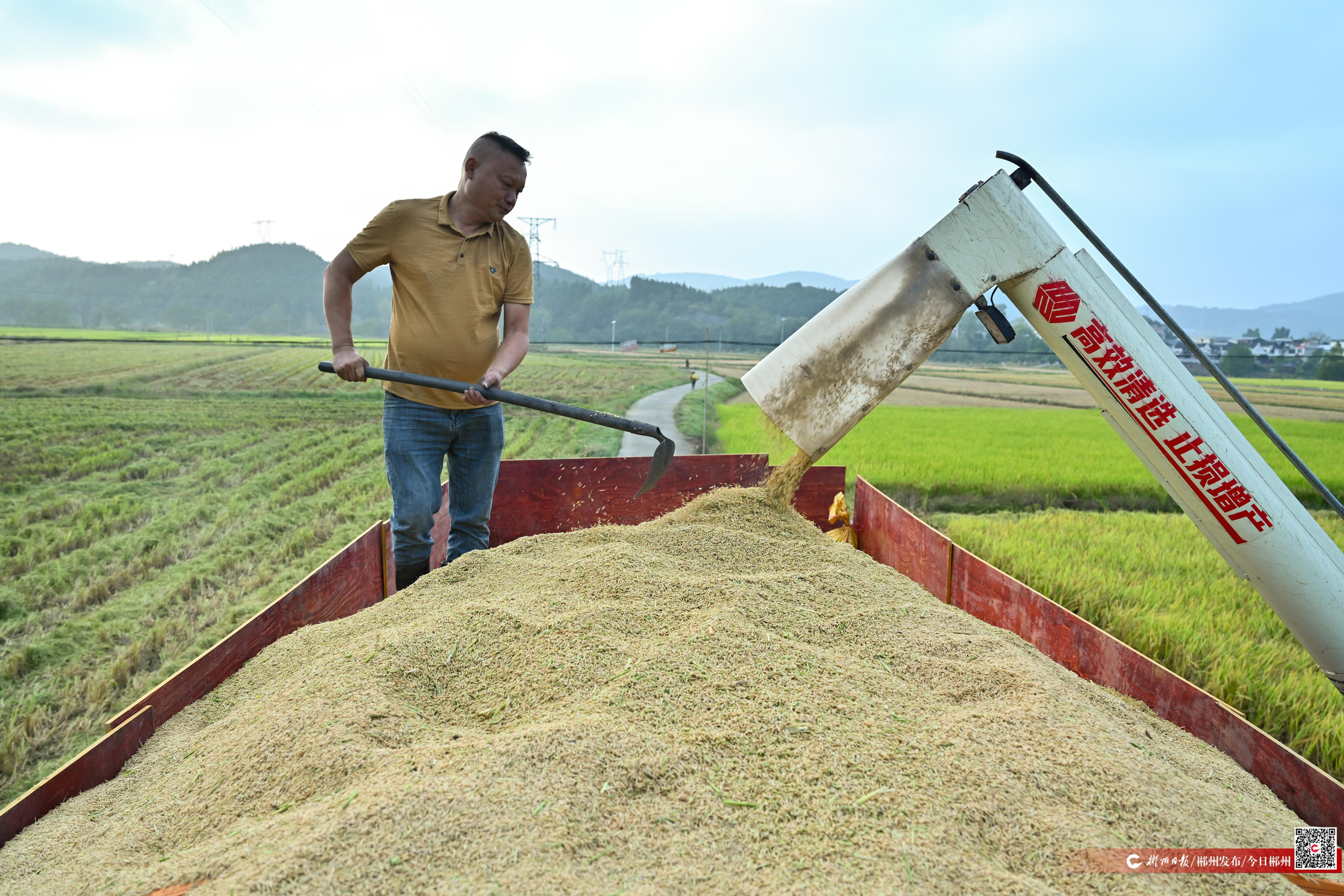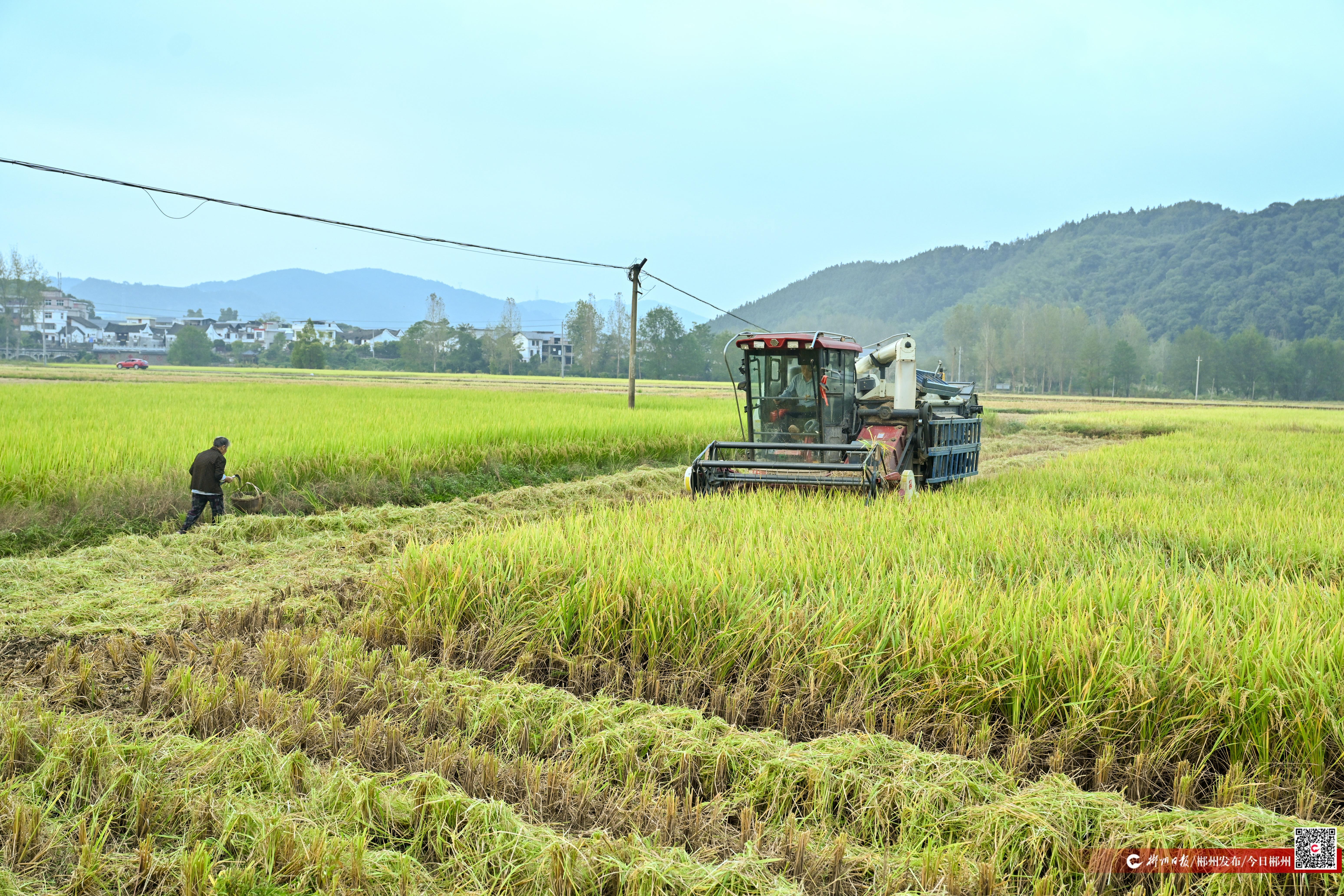 10月16日,第45个世界粮食日。北湖区华塘镇茅坪村村民抢抓晴好天气开展收割作业,田间地头一派丰收的景象。