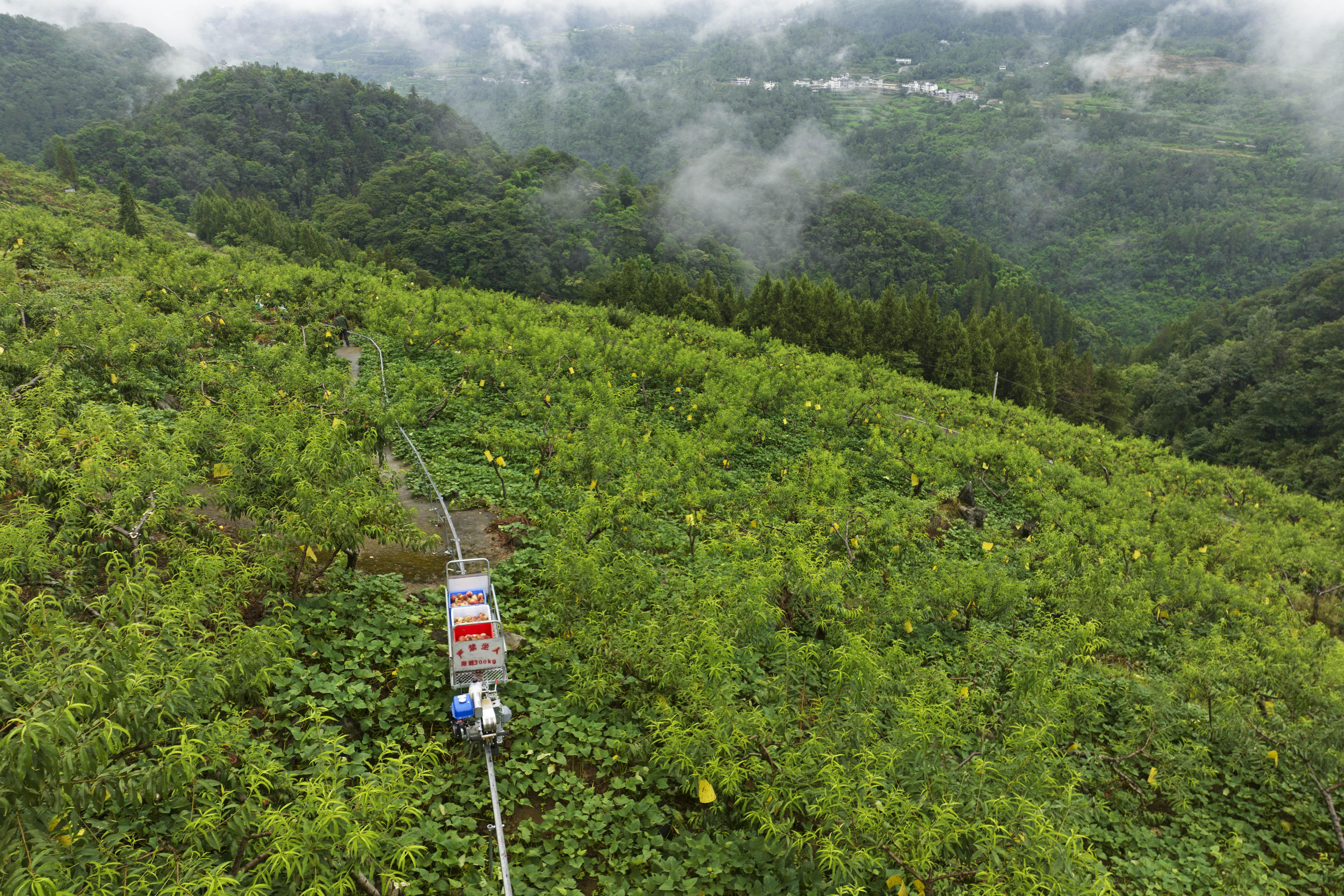 乌江村苹果桃基地里,负责人张洪胜正穿梭在绿荫丛中,为客户采摘苹果桃,不多时便摘了满满7大筐。把筐子装进田间小火车,启动马达,一筐筐水果沿着铁轨,很快就运送到公路边的销售点。