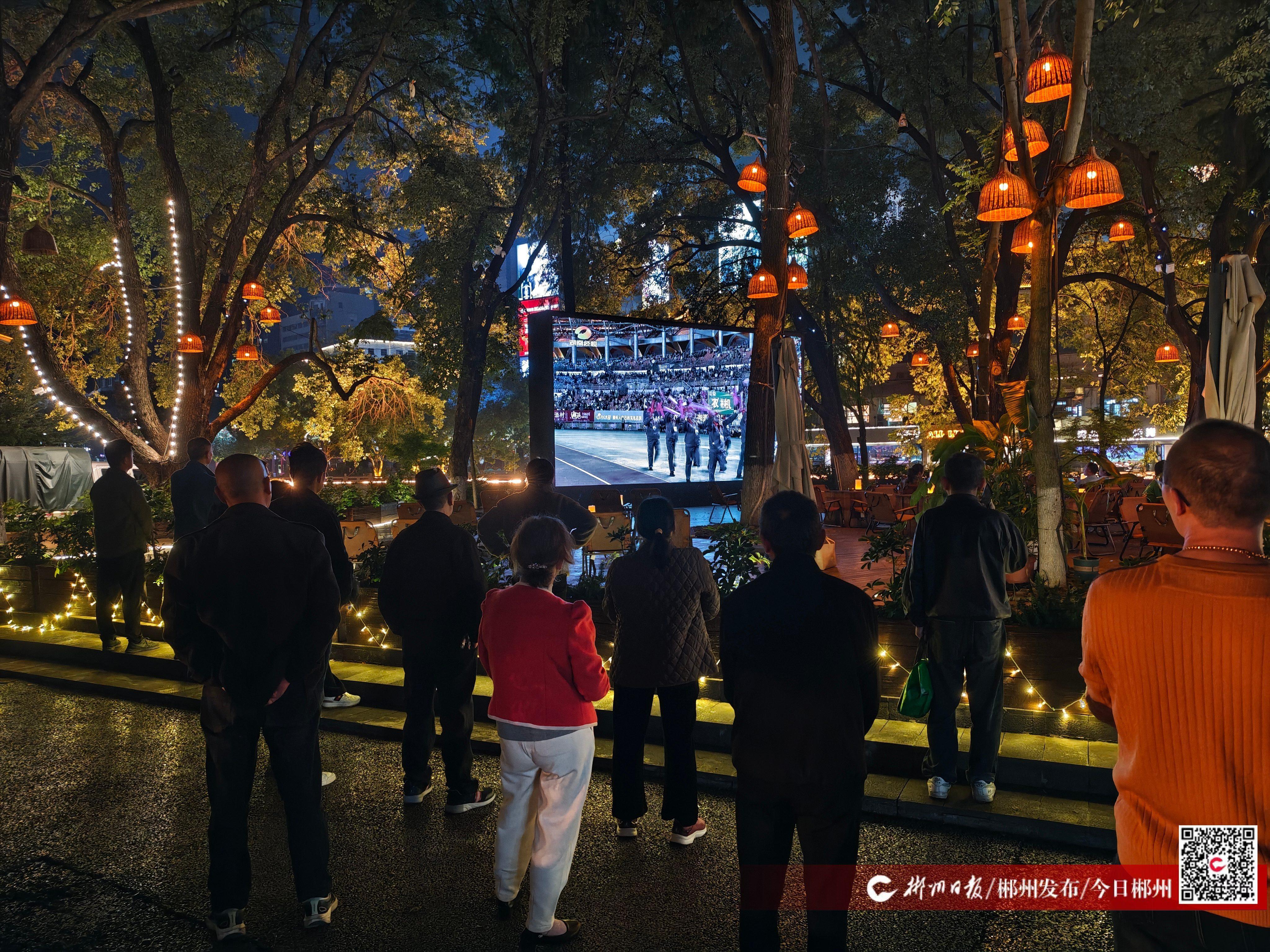 在资兴,东江花月夜广场与小东江吊桥观景平台,成了球迷的“临水赛场”。夜色中的东江映照着广场大屏的流光,数百名市民自发聚集,围坐、站立,目光齐刷刷聚焦于赛事进程。江风微凉,却吹不散人群的热情。每当郴州队发起进攻,呐喊声便如潮水般涌起,与东江的潺潺水声交织成动人的助威曲。