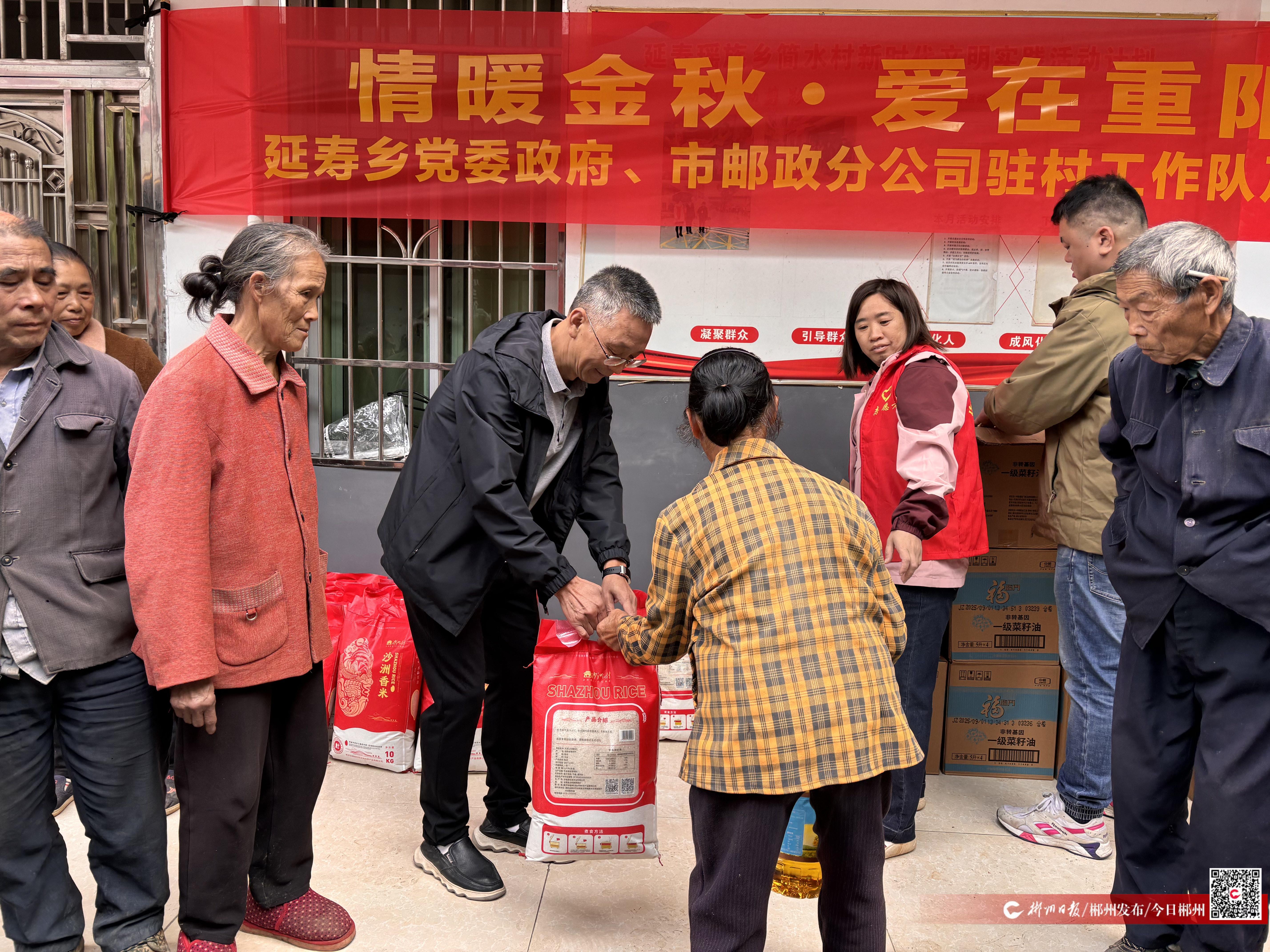 10月29日,在重阳佳节来临之际,郴州市邮政分公司乡村振兴驻汝城县延寿瑶族乡简水瑶族村工作队及汝城县木草人茶叶有限公司组织开展“情暖金秋·爱在重阳”主题慰问活动,为简水瑶族村内70岁以上的老年朋友们送上节日的祝福与诚挚的关怀。