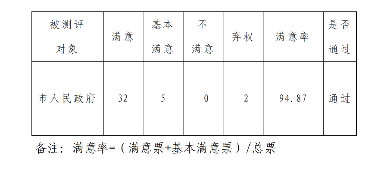 2025年10月28日上午,市六届人大常委会第二十九次会议听取和审议了市人民政府《关于全市林业产业高质量发展情况报告审议意见研究处理情况的报告》,并以无记名投票方式进行了满意度测评。当日,市人大常委会会议应到常委会组成人员48人,实到39人,经电子表决,满意度测评结果如下: