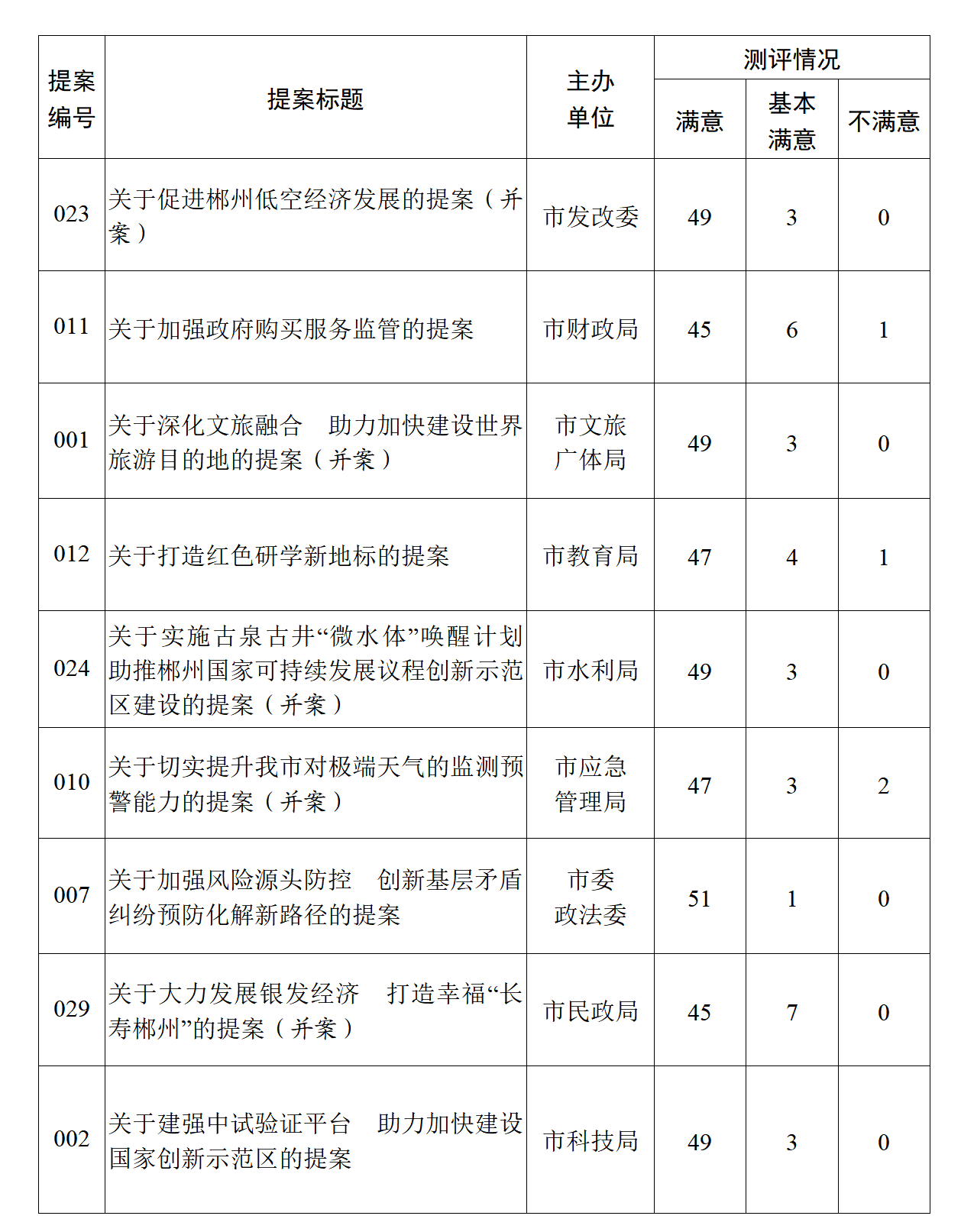 根据《政协郴州市委员会办公室关于开展2025年民主评议重点提案办理工作的实施方案》,2025年10月30日,政协郴州市第六届委员会常务委员会第二十二次会议听取了市发改委、市财政局、市文旅广体局、市教育局、市水利局、市应急管理局、市委政法委、市民政局、市科技局等9个单位关于市政协六届四次会议重点提案办理情况的自评报告和9个民主评议小组的评议意见,并进行了民主测评。本次市政协常委会会议应到常委会组成人员67人,实到52人;经民主评议,测评结果如下: