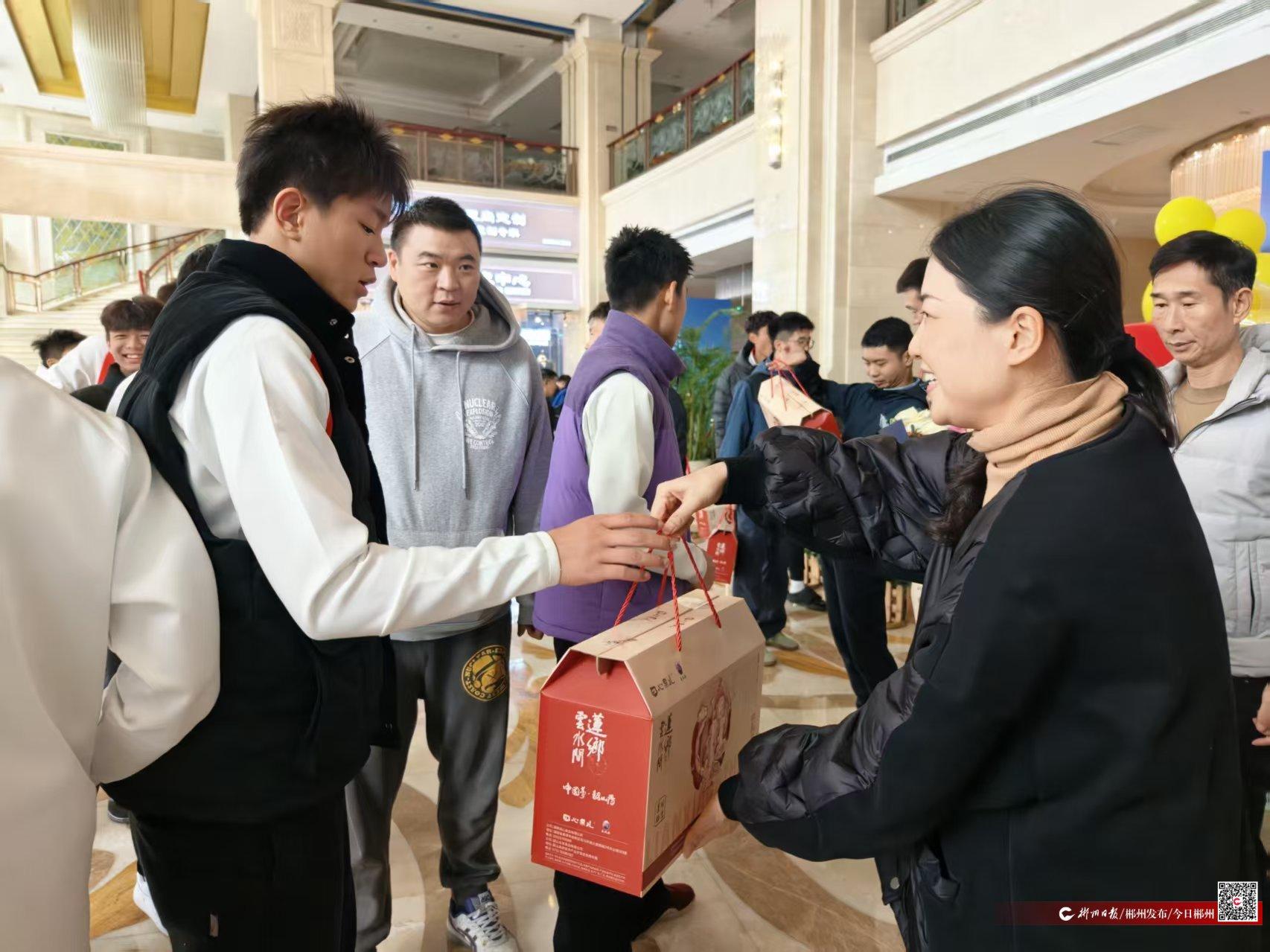 “‘湘’超湘味,‘湘’当有味!”在郴州队下榻的酒店,湘潭球迷跳起啦啦操,湘潭市文旅部门相关负责同志为郴州队教练员、队员送上鲜花,并贴心地送上湘莲特色产品,并预祝郴州队与湘潭队赛出友谊、赛出水平、赛出风格。