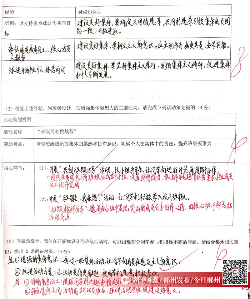“道德与法治课程是贯彻立德树人教育理念的关键课程,要将时事热点融入课堂教学,引导学生关注社会发展动态。”10月31日,试卷命题教师谭菲易在接受记者采访时道出了命题的初衷。她介绍,试卷中,前锋蒋政带伤坚持训练、门将刘翔逆境中鼓舞队友、球迷会成员统一着装擂鼓助威等真实细节,让学生在分析材料时深刻体会到拼搏精神和集体力量。学生们在答题中展现出强烈共鸣,有的立下体育强国志向,有的设计出富有创意的班级凝聚力活动方案。
