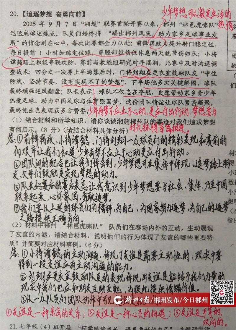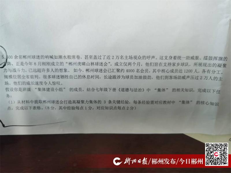 近日,郴州市第五中学的两份七年级道德与法治复习试卷,因选用“湘超”联赛的鲜活素材而备受关注。试卷中,“湘超”郴州队的拼搏事迹和郴州虎啸山林球迷会的助威热潮成为阐述梦想、友谊和集体建设的鲜活案例。