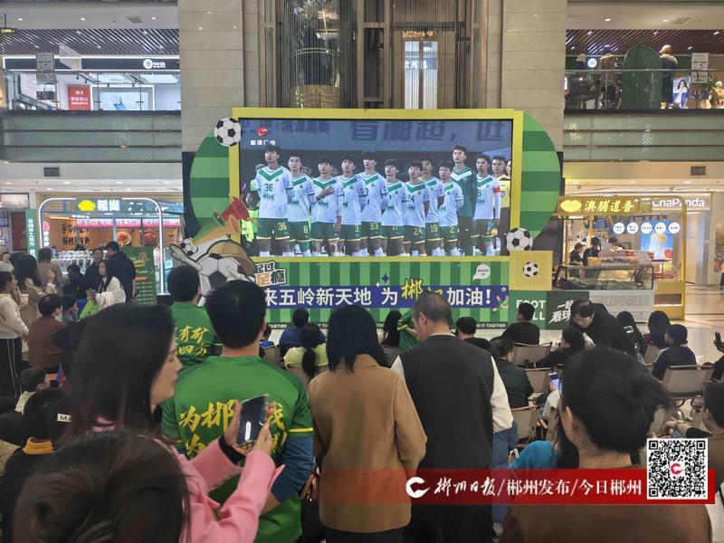 傍晚6点,在五岭新天地商场内,转播大屏幕前已有不少市民在等候比赛开始。晚上7点38分,比赛准时开始,大家纷纷为郴州队加油喝彩,心情也随着比赛的进程跌宕起伏。第3分钟,郴州队8号蒋政的头球差之毫厘,观赛席上顿时响起一片惋惜声。第14分钟,还是蒋政,在接队友右路的传中后,以一记难度极高的凌空抽射,为郴州队拔得头筹。观众席在这一粒进球后成为了一片欢乐的海洋,大家纷纷为郴州队领先而欢呼。