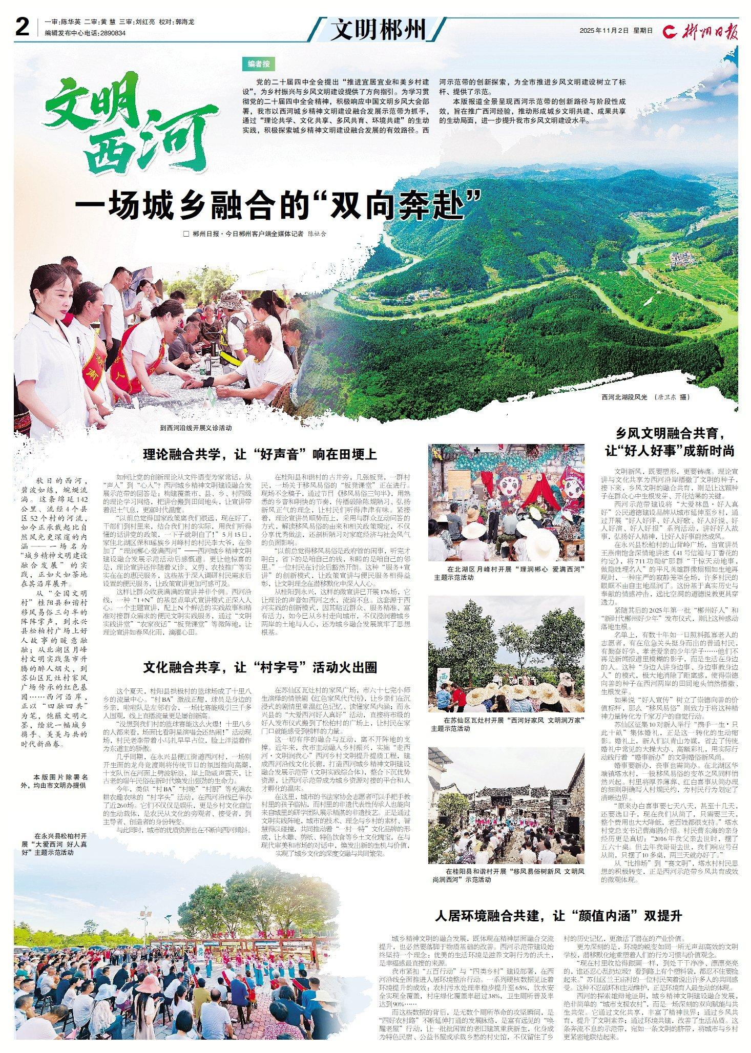 从“全国文明村”桂阳县和谐村移风易俗三句半的阵阵掌声,到永兴县松柏村广场上好人故事的暖意融融;从北湖区月峰村文明实践集市升腾的醉人烟火,到苏仙区瓦灶村家风广场传承的红色基因……西河沿岸,正以“四融四共”为笔,饱蘸文明之墨,绘就一幅城乡携手、美美与共的时代新画卷。