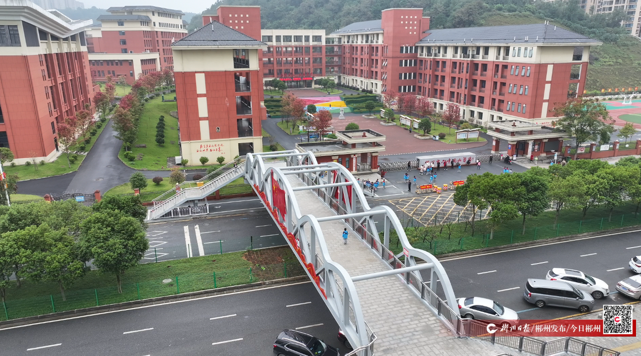 观山大道为城市主干道,双向六车道,日常车流量大。郴州市六中观山学校位于观山大道与福源路交会处西北侧,与湖南建工东玺台等小区隔路相望,过去仅依靠地面斑马线通行。每到上学、放学高峰期,人车混行现象严重,不仅通行效率低,也存在较大安全隐患。