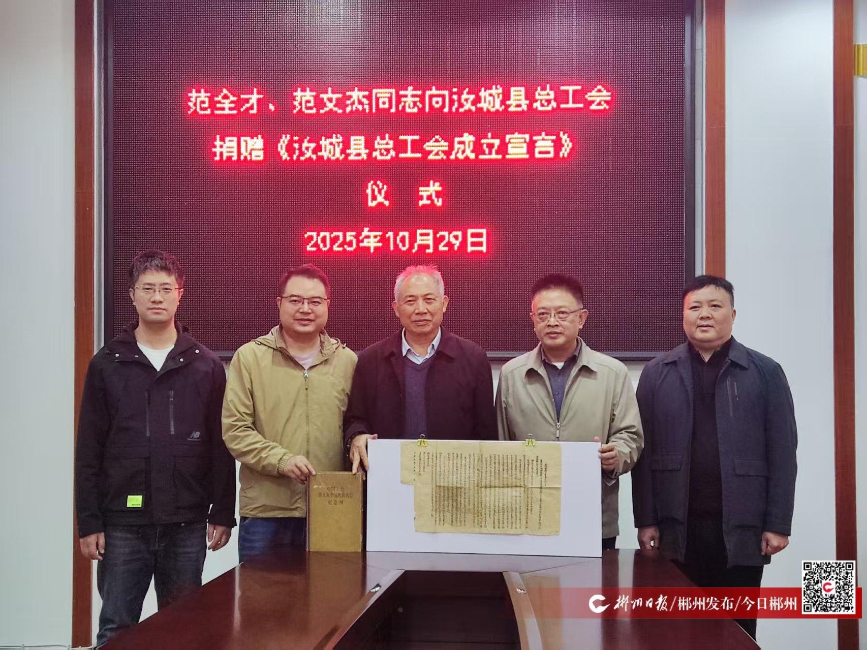 “有人出高价购买,但我们没有动心。我愿意将这珍贵难得的收藏无偿捐赠给汝城县总工会,让更多人看见当年工人兄弟的热血。”近日,70岁的汝城县委组织部退休干部范全才与儿子范文杰,捧着一页泛黄的1926年《汝城县总工会成立宣言》(以下简称《工运宣言》)和一本《中国工会第八次全国代表大会纪念刊》,走进汝城县总工会,将家中珍藏多年的红色文物郑重交到工作人员手中。