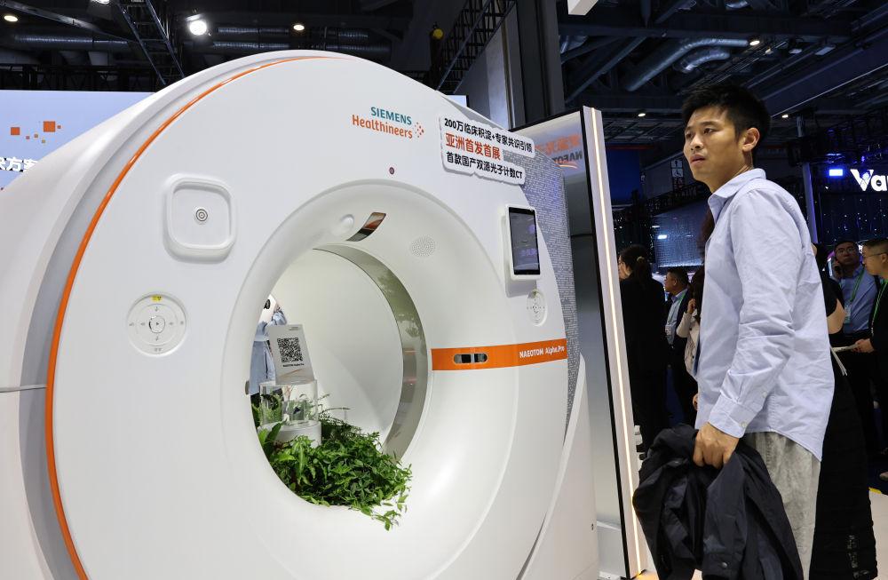 2025年11月6日,参观者在第八届进博会医疗器械及医药保健展区西门子医疗展台驻足观看一款亚洲首发首展的CT机展品。进博会是全球新品首发地,更被视为前沿技术“首秀地”。