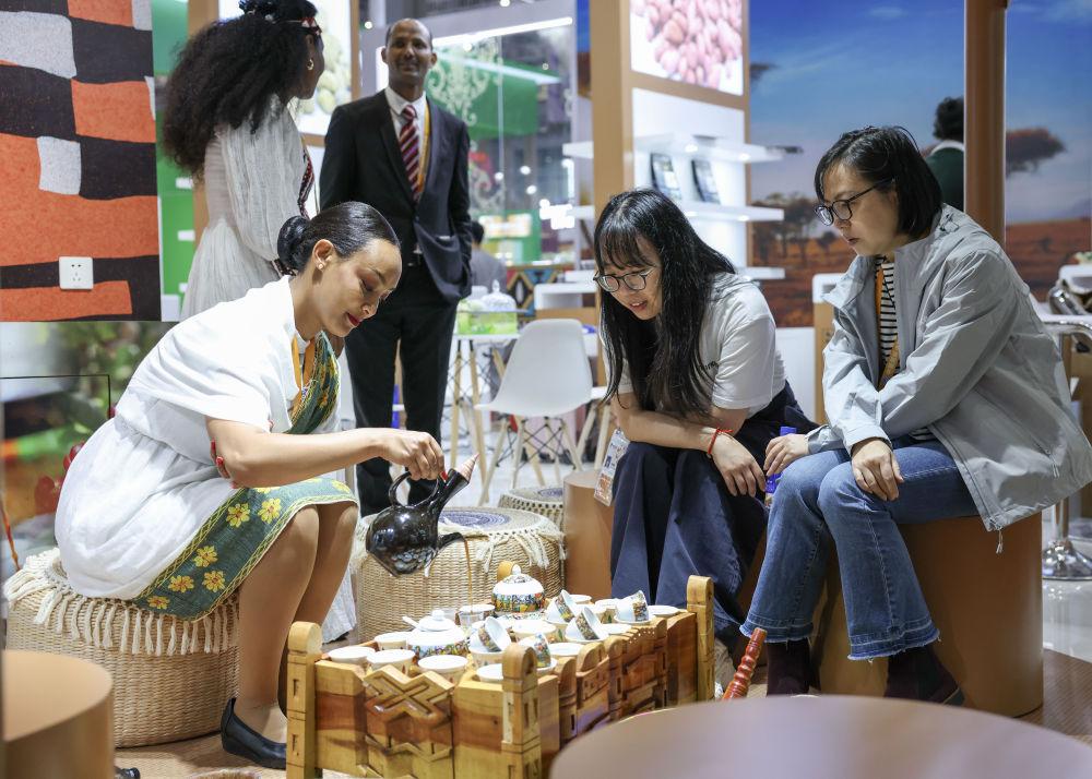 2025年11月7日,人们在第八届进博会国家展埃塞俄比亚馆品尝咖啡。本届进博会上,共有来自123个共建“一带一路”国家的企业参展,同比增长23.1%;来自最不发达国家的企业达163家,同比增长23.5%。自首届起,进博会便为最不发达国家提供免费标准展位。本届进博会首次为最不发达国家产品打造专区,扩容非洲产品专区,支持非洲建交国用足用好100%税目产品零关税政策,非洲企业参展数量同比增长80%。
